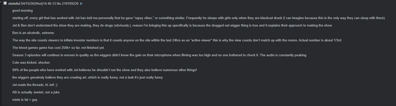 >>219767897Jet never fails to impress with how often he fucks up. How can he be so naïve at this point to think there is even a slight possibility that the journalist is intending for this to have mutual benefit? Sam has long distanced himself from the show, because if he was included in any of this he would've stuck it down immediately