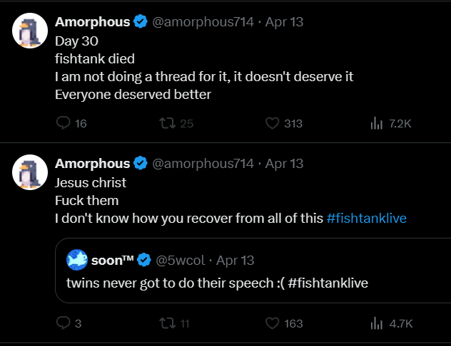 >Links https://fishtank.rip/https://www.fishtank.livehttps://kick.com/fishtankhttps://fishtank.observer/https://classic.fishtank.livehttps://x.com/fishtankislivehttps://old.reddit.com/r/fishtanklive/https://www.instagram.com/fishtank.live/https://www.youtube.com/@fishtankislivehttps://en.wikipedia.org/wiki/Fishtank_(web_series)https://fishtanklive.fandom.com/wiki/Fishtanklive_Wikiprevious: >>219770777