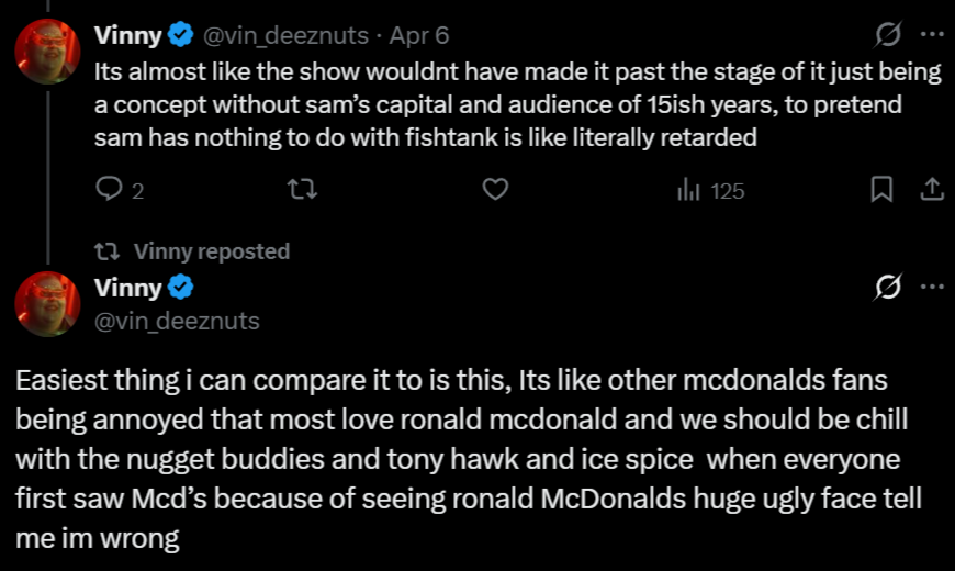 >>219776690>still think he was pretty fun in the tankThen you are ngmi. I clocked that loser as a total faggot by the end of his first night but people didn't believe me.>but dood he posts on ftl that means he must be cool!Mist ftl posters suck ass, half of you mother fuckers are obsessed with the nontent twins,