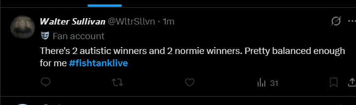 James Drake is the best fish this season. Responded to my DM instantly and we chatted it up without any "le afraid of weird fishtank fans" and ghosting gayness. Just a solid dude, happy he won.