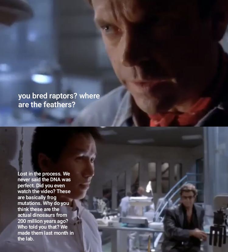 wouldn't they just edit out the genes that make them grow feathers? just to fit public perception of how dinosaurs look? it's a theme part, not a science experiment