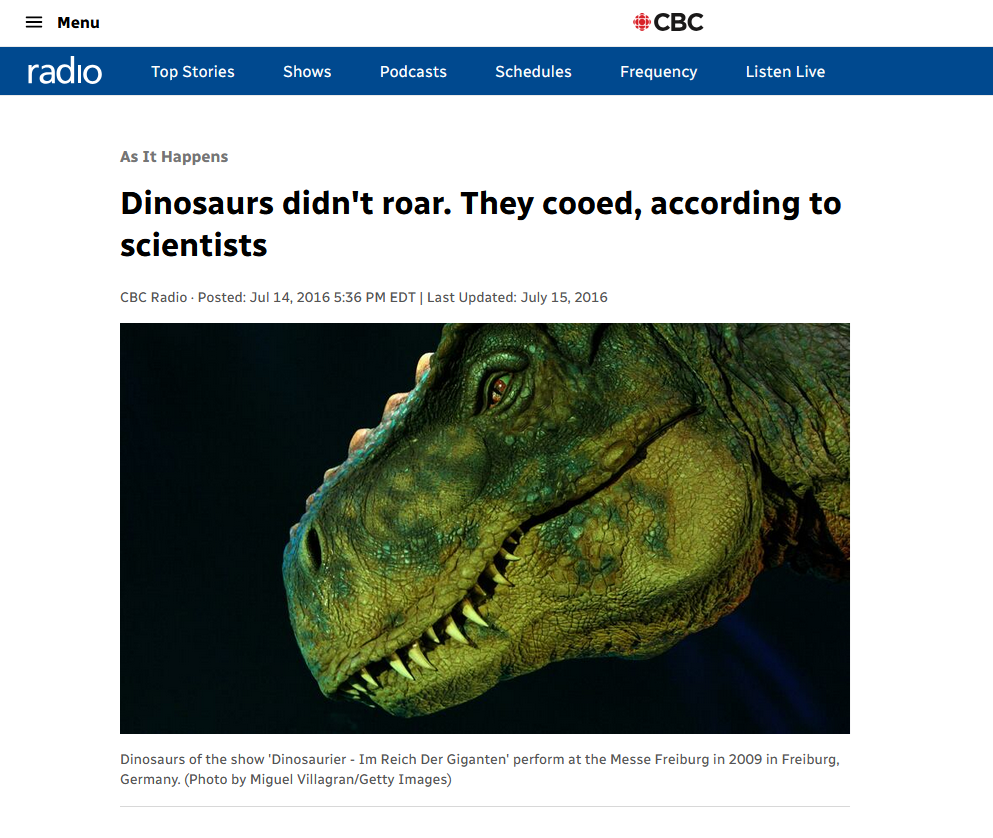 >>219796034>>219798353The "maybe dinosaurs actually cooed" story is the dumbest thing because it doesn't account for how diverse dinosaurs were. How they dominated the earth for ~130 million years and came in all shapes and sizes. Saying they all made the same types of sounds is like an alien saying all mammals on earth right now sound the same