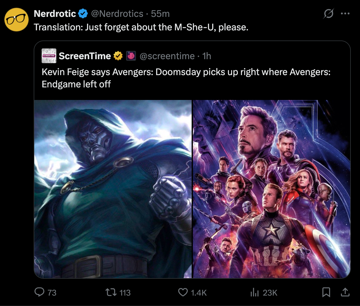 People are missing the subtext here. If Doomsday takes place between Endgame and the M-SheU then the events of Doomsday *cause* the M-SheU.