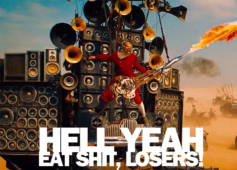 >>219816871In the future, everyone has a war machine, nobody wears seatbelts and everyone tries to be as flammable as possible. Damn right. This is exactly how I'd make everything if I was ruler of the world: gratuitously dangerous.So basically Charlize Heroine tricks a bunch of Quan Chi suckers into going on a "detour" while on a fuel run. All her henchmen are gullible idiots, and you don't know what the hell is going on because who cares. Then Skull Jaw decides to chase her with all the badass cars he has in his arsenal. This includes the coolest vehicle in the existence of mankind: a mobile death concert with a flamethrower-wielding guitarist pumping metal at an 11.At this point I'm full-on rooting for the bad guys.Then Mad Max and Charlize Heroine trade blows that are non-sexual yet still satisfying, and they drive into a sand storm that looks super badass and all the morons chasing them get their stupid cars destroyed. This part looks so awesome that Mad Max even pauses during the action just to watch people blow up. It's as if he knows he's acting in this awesome movie and he's getting paid to do his job, but even he can't help but sit back and think about how cool his life is going to be after this movie and how he's going to spend the rest of his life getting his knob polished by conjoined supermodel twins for being in this awesome scene.After all that action suddenly Mad Max wakes up in the desert and sees a bunch of total babes having a wet t-shirt contest. One of the chicks is preggo with Skull-Jaw's child and Mad Max suggests she get off her feet by shooting her in the leg. Then they get chased again for about an hour of the most badass car chasing scenes I've seen up to this point in my life (or yours).There's even a scene where the preggo chick gets run over and her baby dies and you text your mom to tell her you wish you were run over in her womb because that was so awesome and she writes back and asks you if everything is okay.