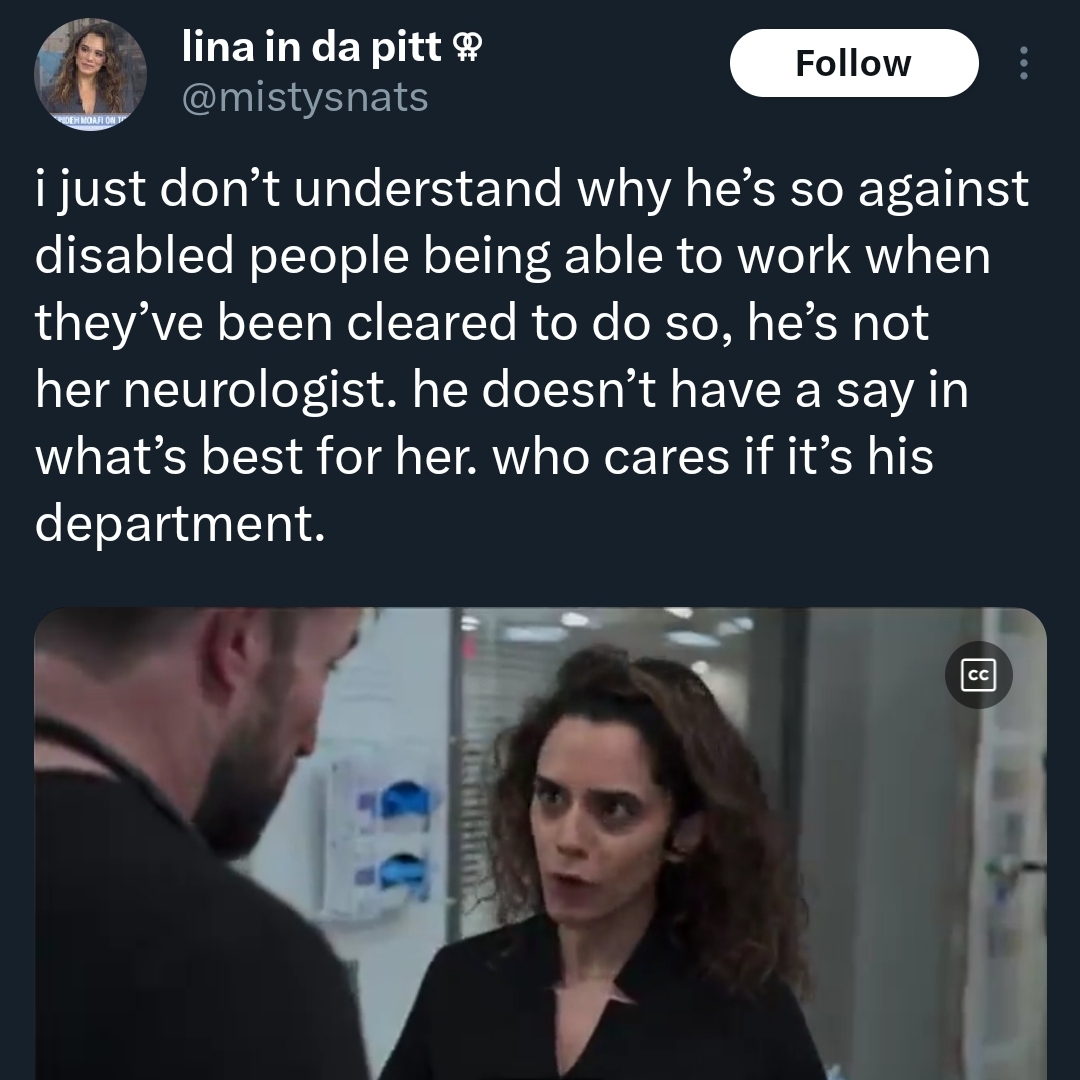what the fuck was even the point of releasing this season, literally nothing happened in the end>schizo black kid: DROPPED>santos cuts herself and steals a scalpel: DROPPED>santos treating deaf woman who needs interpreter like a retard: DROPPED>dilemma over Whittaker dating widowed patient: DROPPED>Whittaker's ID card stolen and made a huge deal about: 2 SECOND GAG>Al Hashish AI chatbot: DROPPED>Dr Rabbi wants to kill himself/doesn't want to leave: UNRESOLVED>woman whose kid baked his brain in the car: DROPPED>nurse getting arrested by ICE: DROPPED>aggro brain tumor guy: DROPPED>ogilvie getting exposed to tuberculosis: DROPPED>asian doctor possibly getting AIDS from a junkie: DROPPEDthere's for sure some other shit I'm missing but it's crazy how many plot points get brought up and never resolved