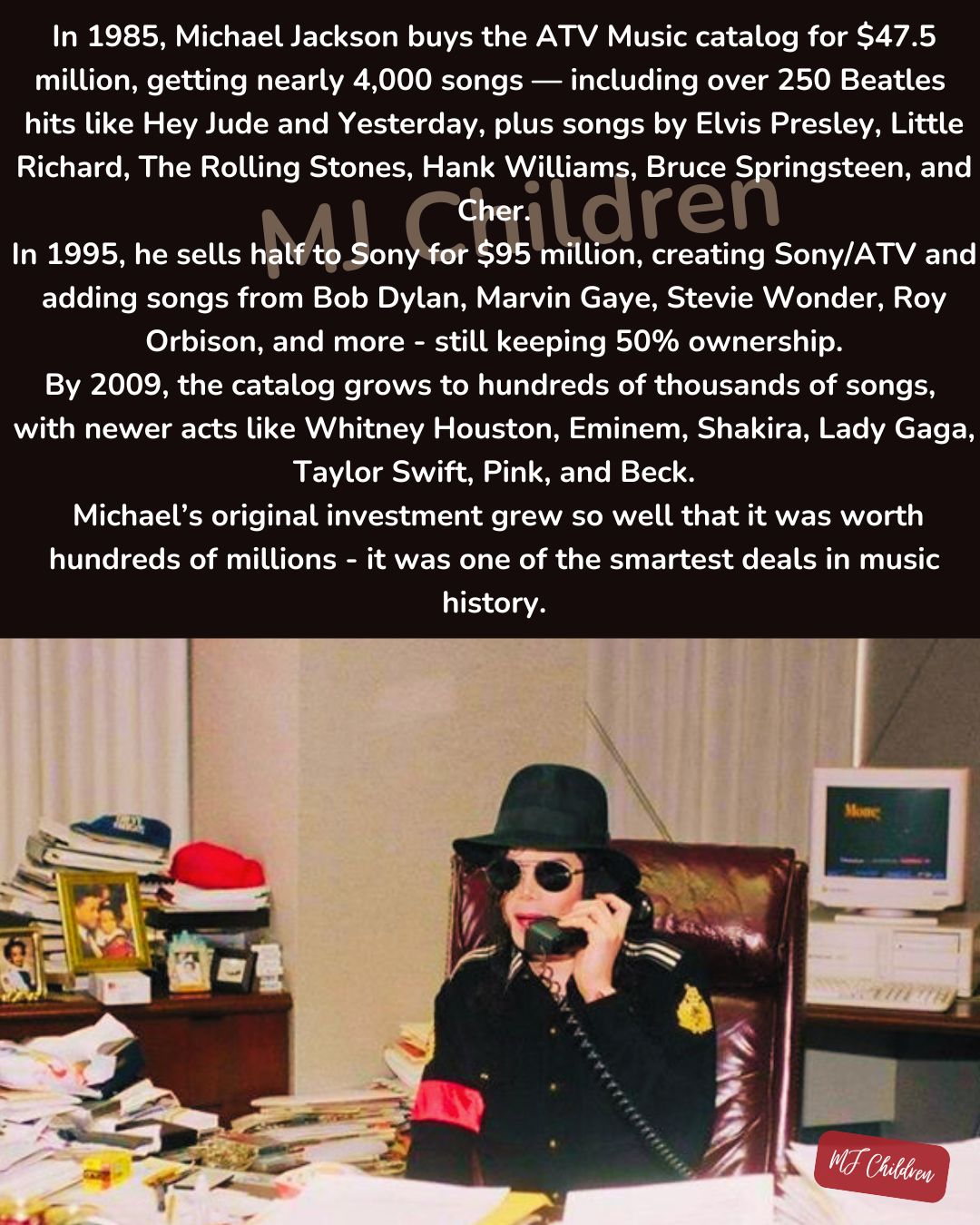>>219849071Reading about Sony/ATV makes it hard to think otherwise. How the fuck did MJ became the biggest owner of music in the world and how is this not common knowledge?I thought he was just a popular singer/dancer and it turns out he's the biggest music tycoon in history and he outmanoeuvre all the major media companies of the time?