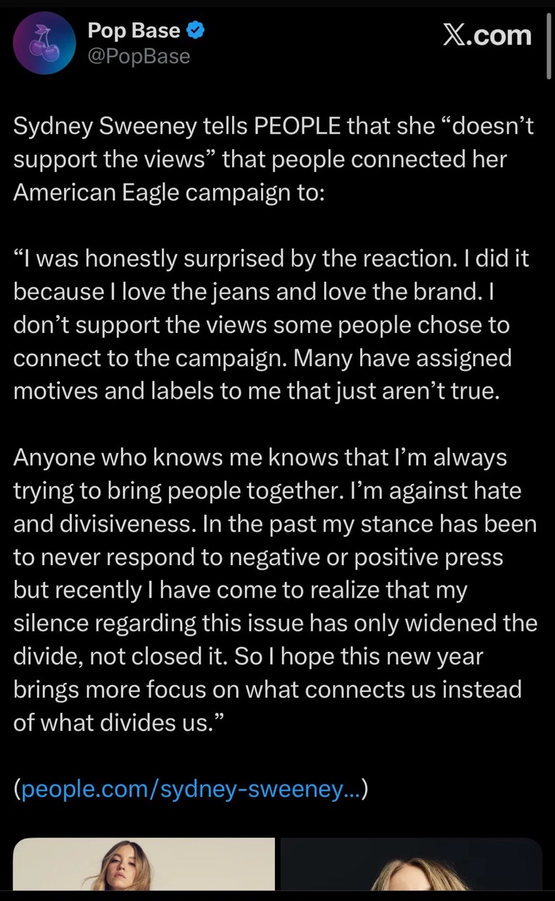 >>219851872yes it really is the case, the simply reason being that Sweeney didn't apologize for the American Eagle jeans ad in a short enough time frame and is now considered MAGA which means she'll get tons of shit for just about everything she does rather than be given any degree of grace that's customary for political allies of the left.