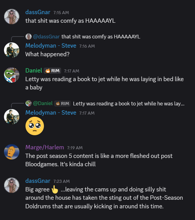 >>219859798yeah she doesnt care thats why as soon as Bash and Vimp went back in their room she stood outside trying to listen in, because she was SO SURE they were plotting against them, when in reality Bash was just talking to Vimp about life and theology