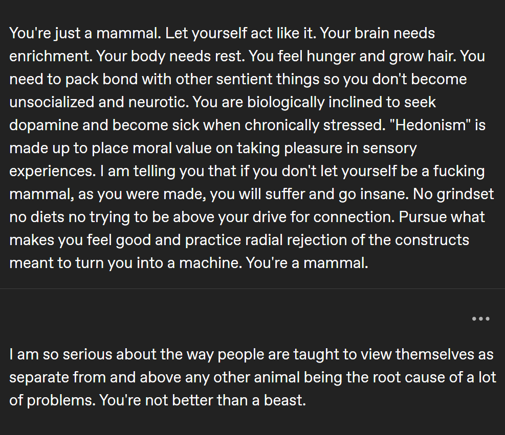 >>219869902Every time, always the same drive in the end. The need to be told you are special, to have a participation trophy just for existing. To need someone to tell you what to do because you are a hollow npc.