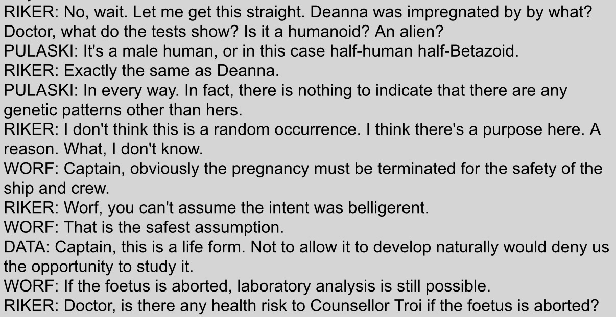 >PICARD: A life form of unknown origin and intent is breeding right now inside Counsellor Troi. Our purpose here is to determine what is to be done about this very unusual situation. Discussion.Someone actually wrote this line