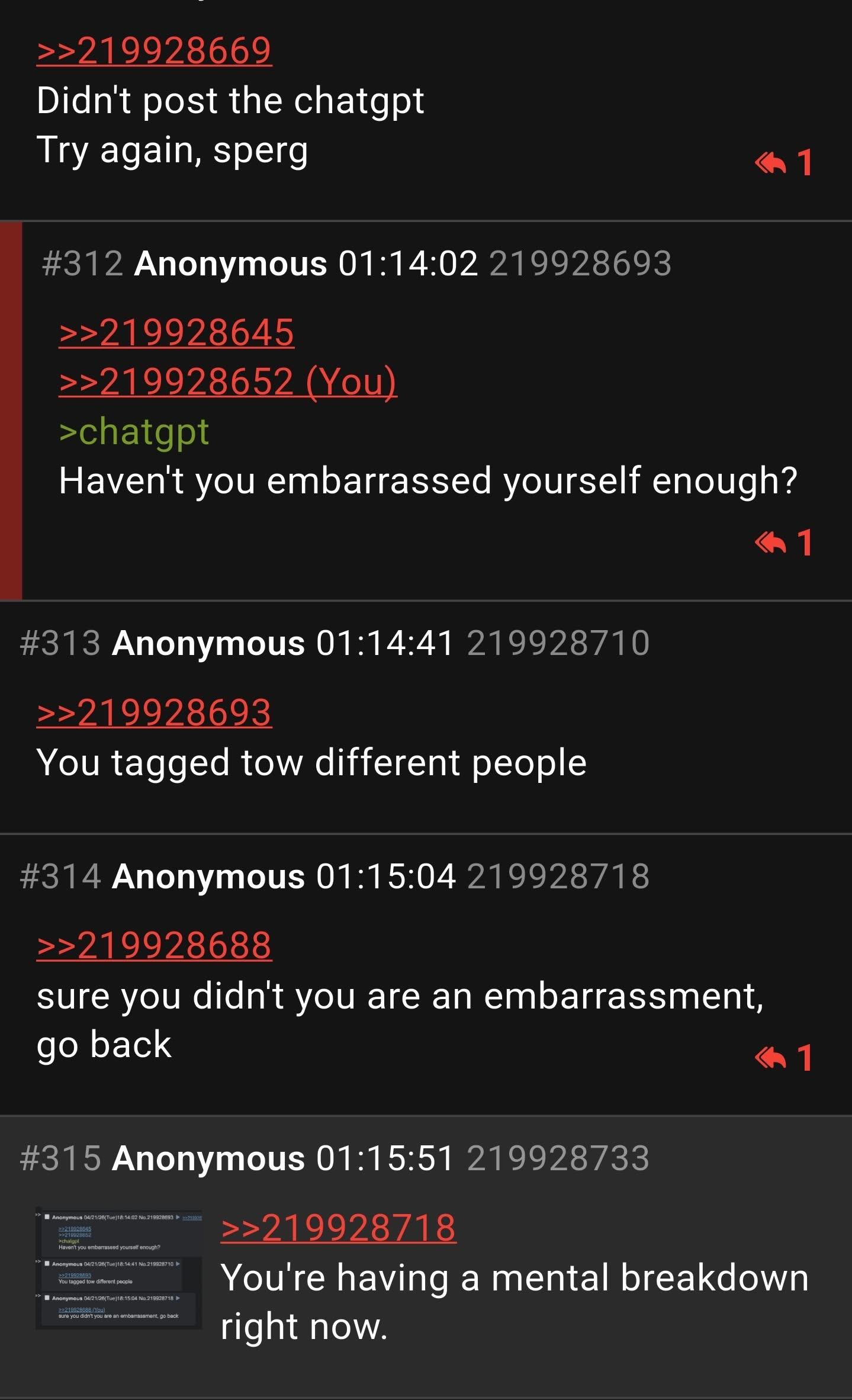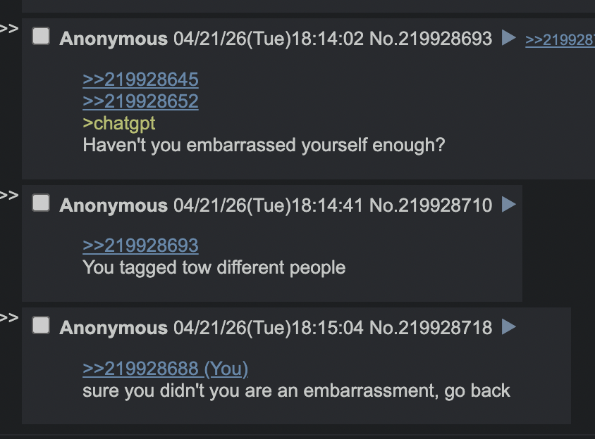 >>219928645>>219928652>chatgptHaven't you embarrassed yourself enough?