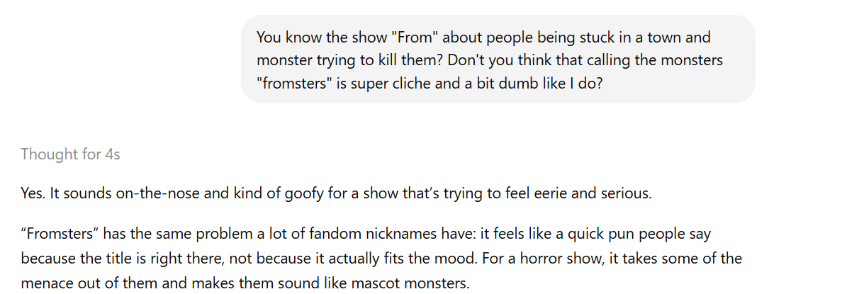 hey, do you know about the show "from"? do you think it is appropriate - or even clever - to call the monsters in that show "fromsters"? please and thank you :)>Yes — and I think “fromsters” is pretty funny, and also a bit clever. It works because it mashes the show title From into a monster nickname, and fans already tend to give the creatures informal labels since they don’t have a strong official name in the series.>Is it appropriate?>Mostly yes, especially in casual conversation. The show’s creatures are generally referred to as “the monsters” or “the creatures,” so “fromsters” feels like a playful fandom nickname rather than something that clashes with canon. It’s probably best for jokes, recaps, memes, or chats with other fans, not as a serious term in formal discussion.>Is it clever?>A little, yes. It has that neat little wordplay effect: From + monsters = “fromsters,” which is memorable and easy to say. It’s not the deepest pun ever, but it’s exactly the kind of goofy, sticky nickname that can catch on if enough people enjoy it.>My takeI>’d call it lightly clever and very usable. If you want the name to sound more serious, “the creatures” is better; if you want something playful and fan-y, “fromsters” absolutely gets the job done.