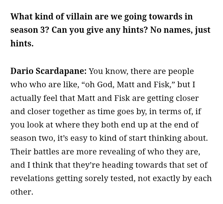 Vincent D'onofrio confirmed that S3 will explore the consequences of the events of S2 on his psyche, but that the Mayor Fisk storyline is over and the Daredevil/Kingpin rivarly won't be the main focus anymore, so he probably has a side role instead of being the main villain.