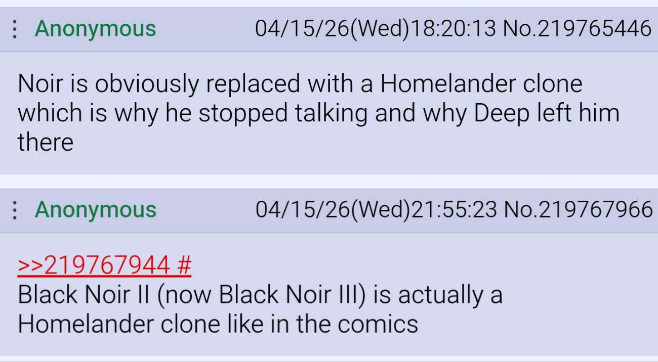 >>219942214That was so lame. It would've been a good reveal if they went with noir being the same dude as last season except homelander had enough of him yapping so he ripped out his tongue and disfigured him to look and act like OG noir.