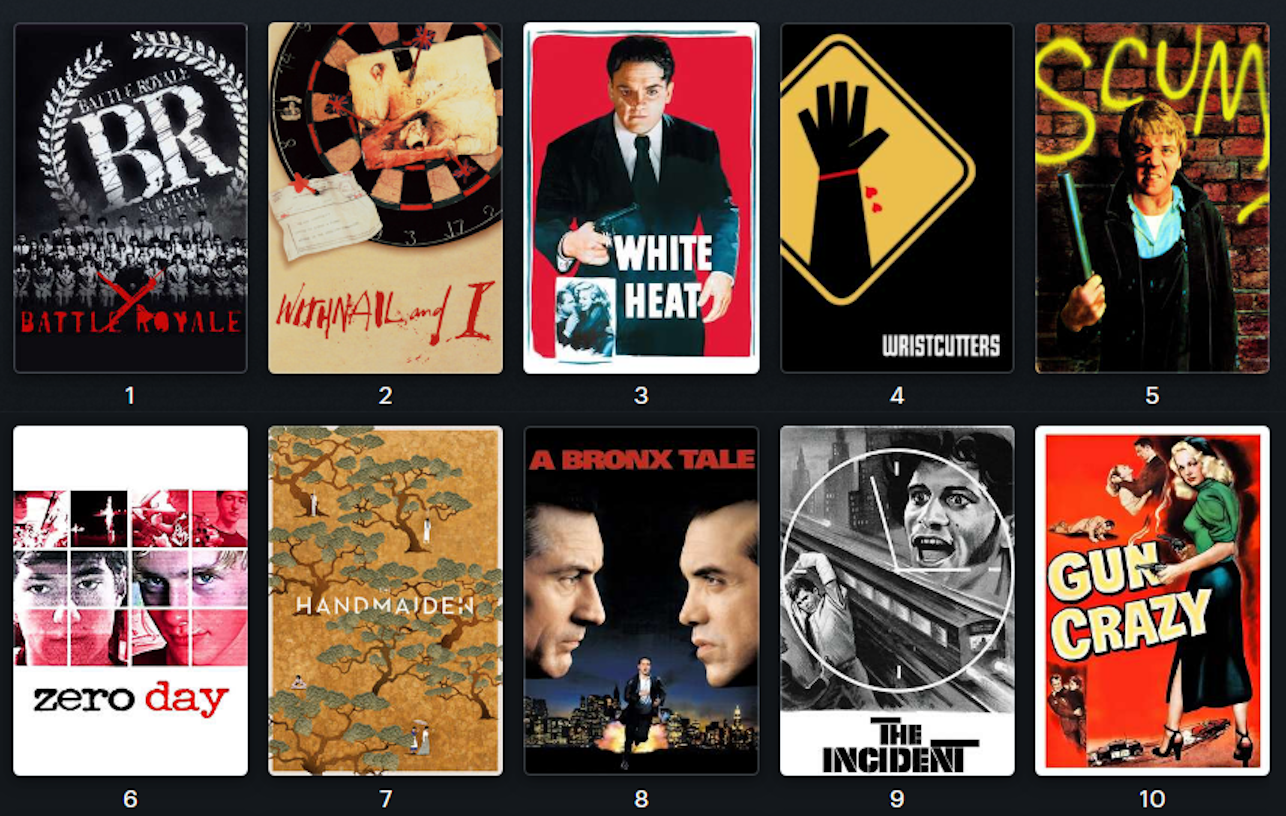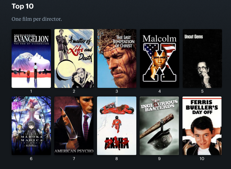Every single one of you is lying. Your top 10 is list you trying to be cool, edgy, funny etc. The only true way to know what you like is to show us your top 10 most watched films. Not fake curated lists to get (you's)