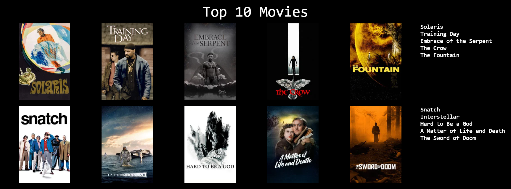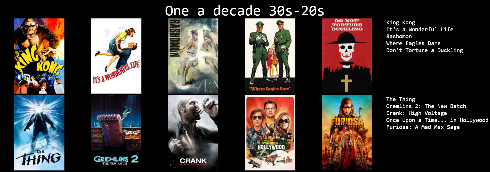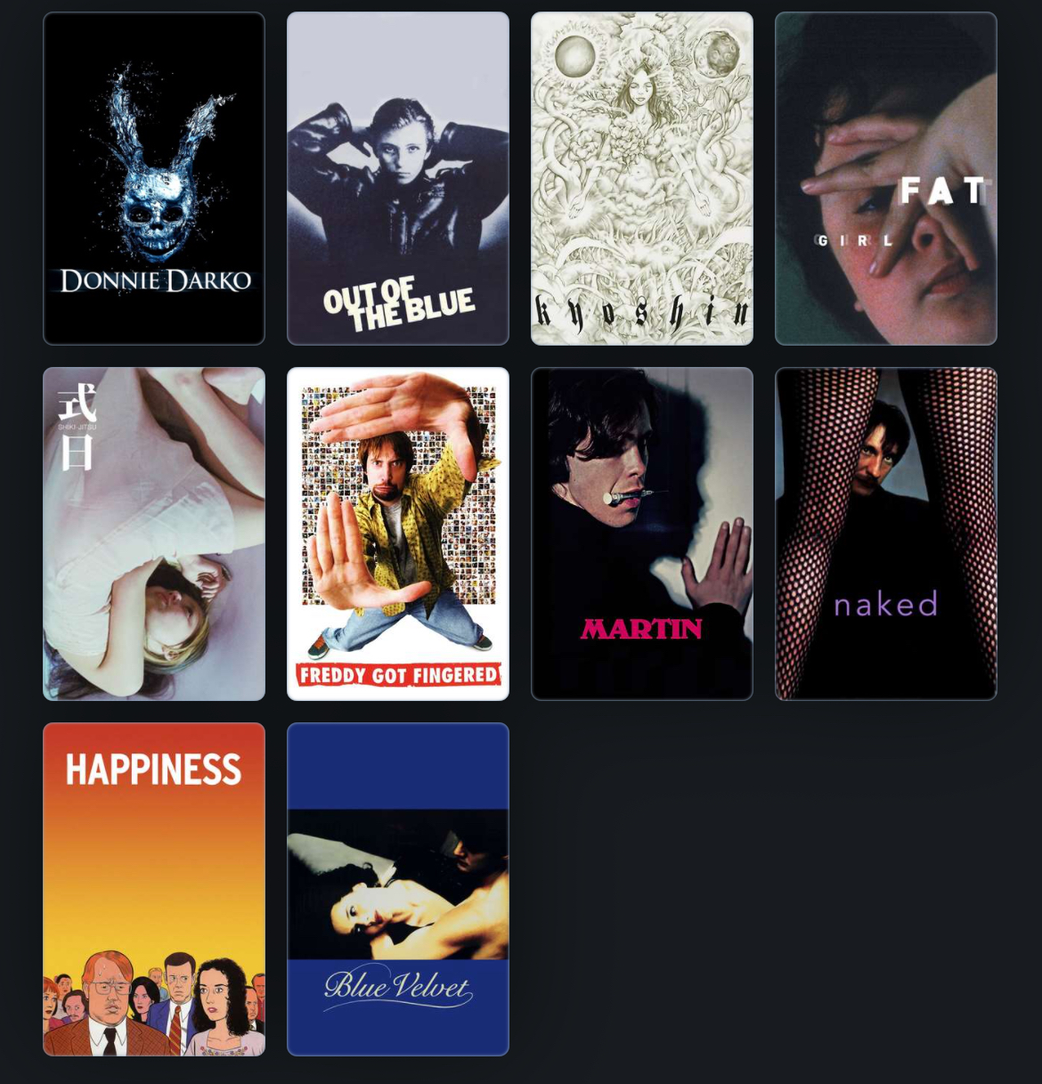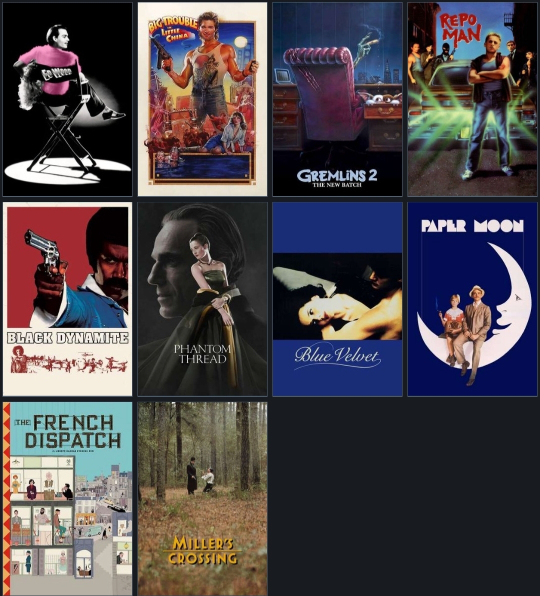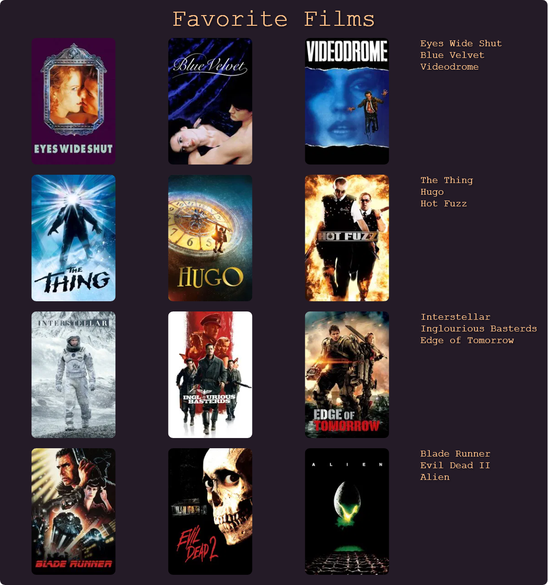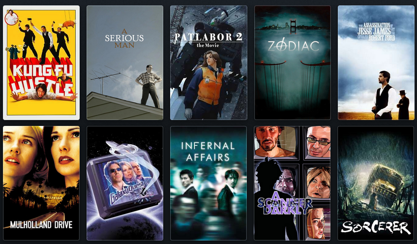 1. No Country for old men2. There will be blood3. Big Lebwoski4. A Serious Man5. The Thing6. Tremors7. Killer Klowns From Outer Space8. Koyaanisqatsi9. Ghost in the Shell10. Freddy vs. Jason