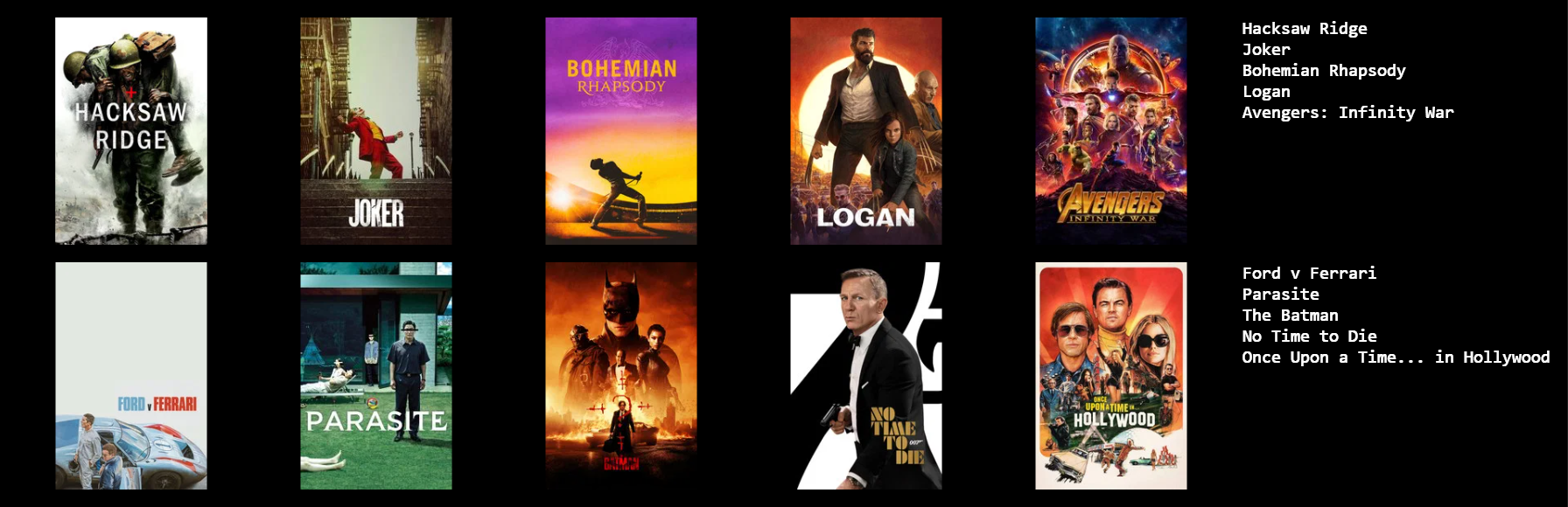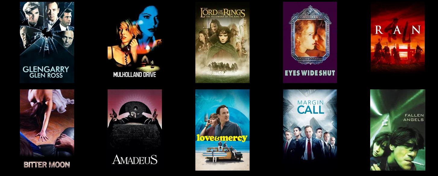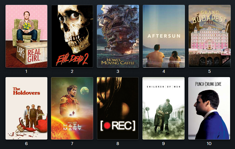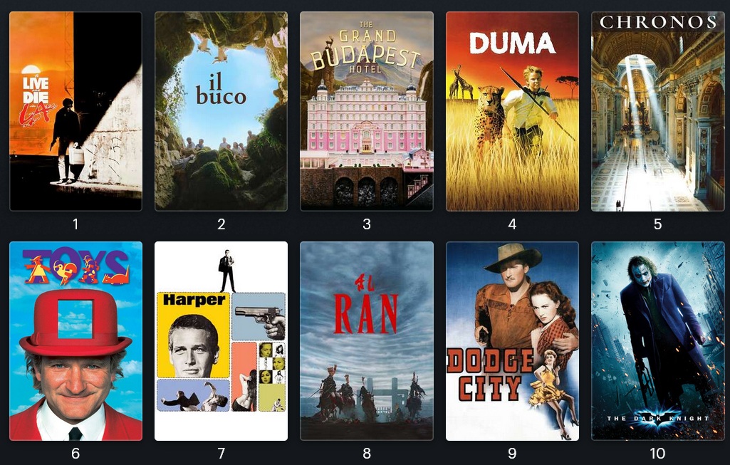 1) The Godfather II2) The Godfather3) Star Wars ROTJ4) Toy Story5) No Country For Old Men6) The Matrix7) Blade Runner8) The Dark Knight9) O Brother, Where Art Thou?10) The Grand Budapest Hotel