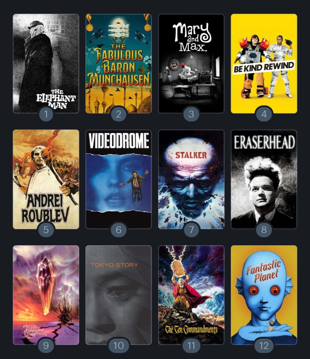 >>2199416401. The Thin Red Line2. Wall-E3. Close Encounters of the Third Kind4. Mad Max Road Warrior or Fury Road 5. The White Diamond6. Cool Hand Luke7. Lilo and stitch8. Peewee's Big Adventure9. Wild Strawberriesidk if this is even well ordered I kind of just came up with ones that immediately came to mind>>219941765Russian Ark is pretty amazing>>219941858I found Howl's Castle, Budapest Hotel and Children of Men all to be incredibly overrated and boring>>219941947Elephant man could be in my top 10. Tbh the only Lynch things I've really liked so far are that, Blue Velvet and The Straight Story. Never watched past season 1 of Twin Peaks but remember it enough to pick it up again