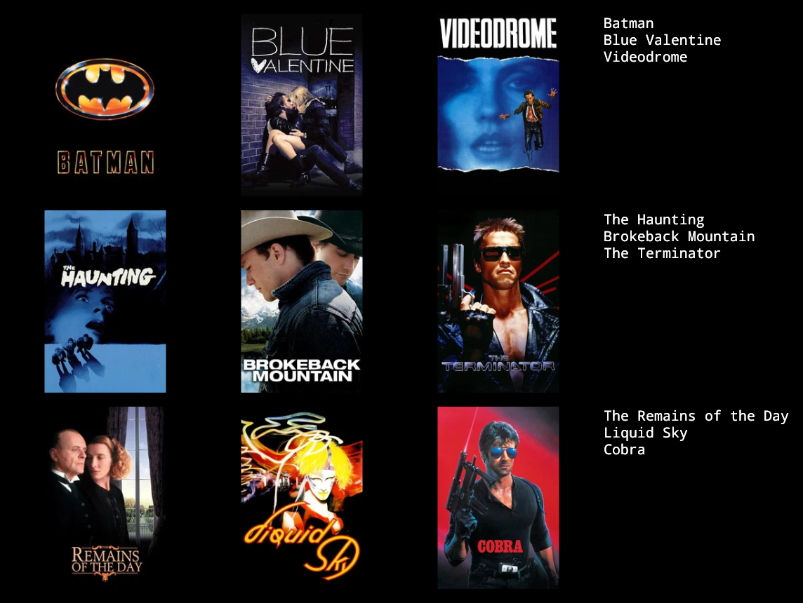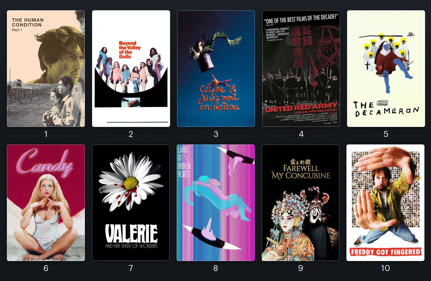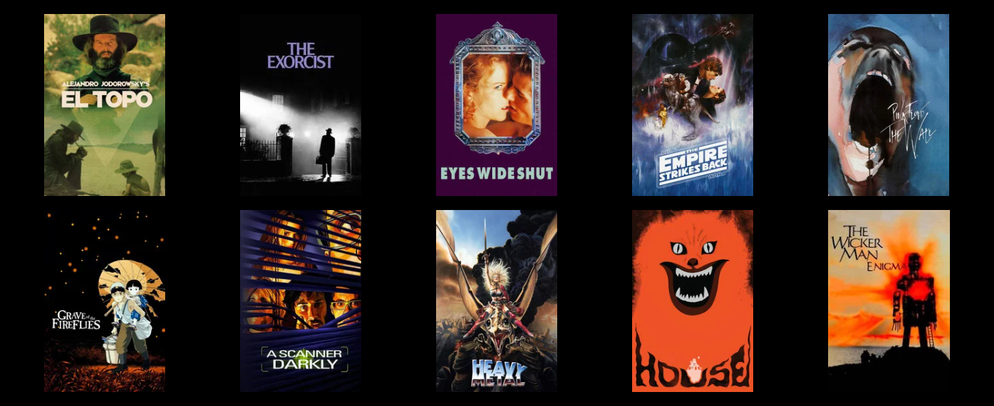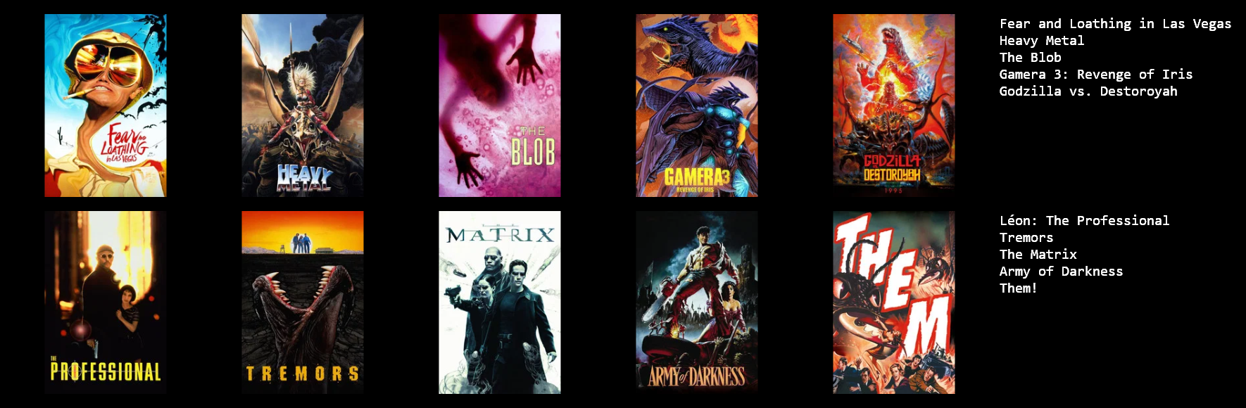 1) Hackers2) Superman (1978)3) Fort Apache4) Bringing Up Baby5) Blade Runner - Final Cut6) Come Drink With Me7) The Sound of Music8) Black Sabbath (1963)9) Southland Tales - Cannes Cut10) Austin Powers: International Man of Mystery