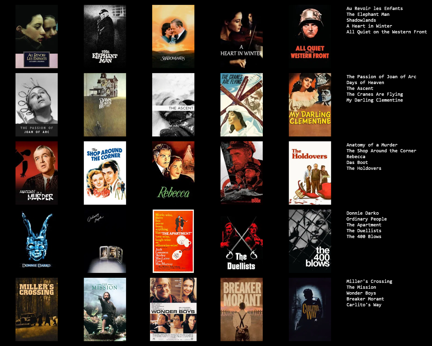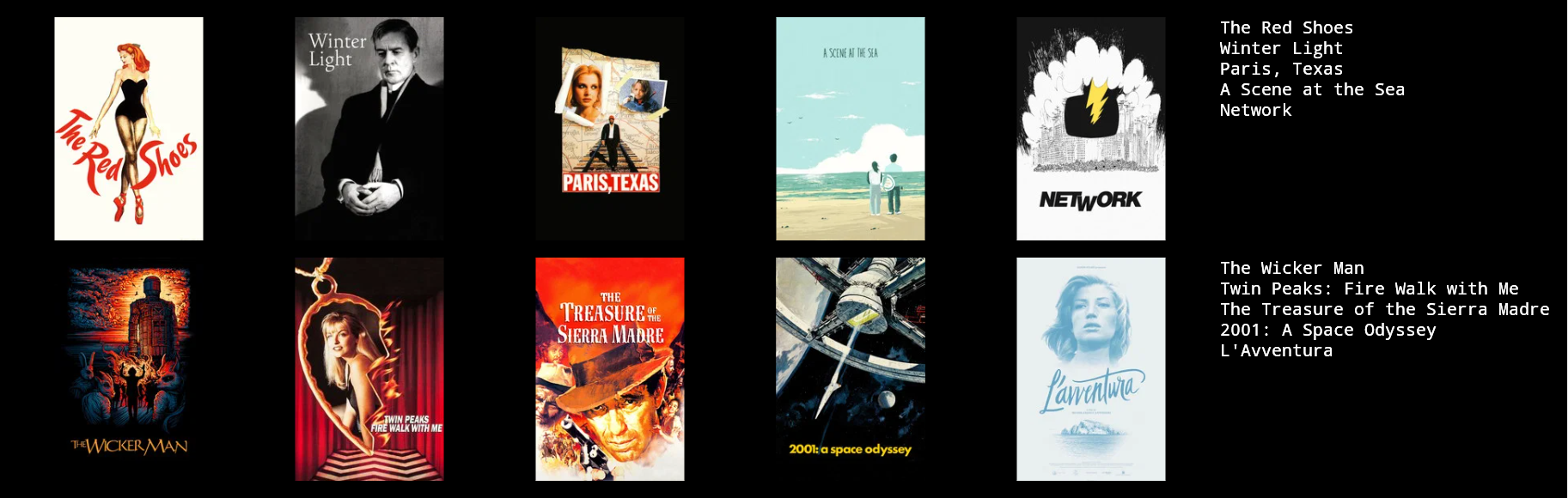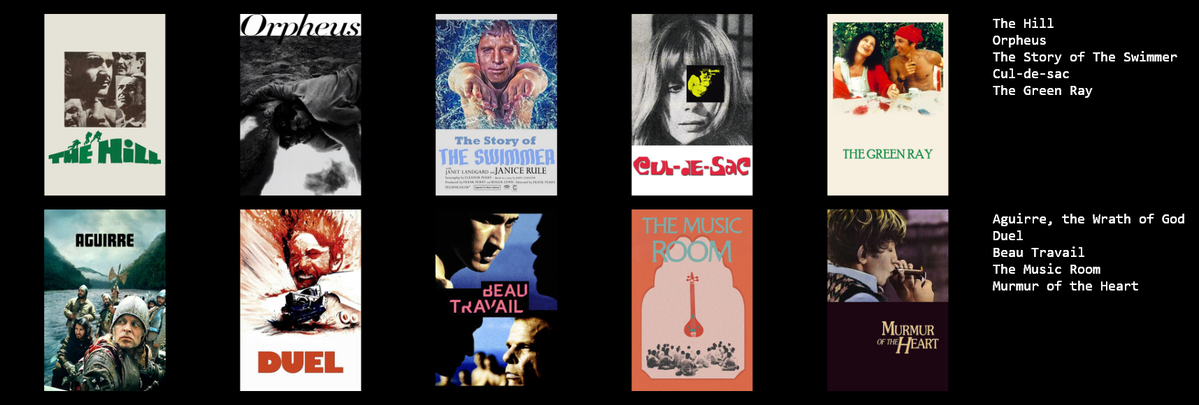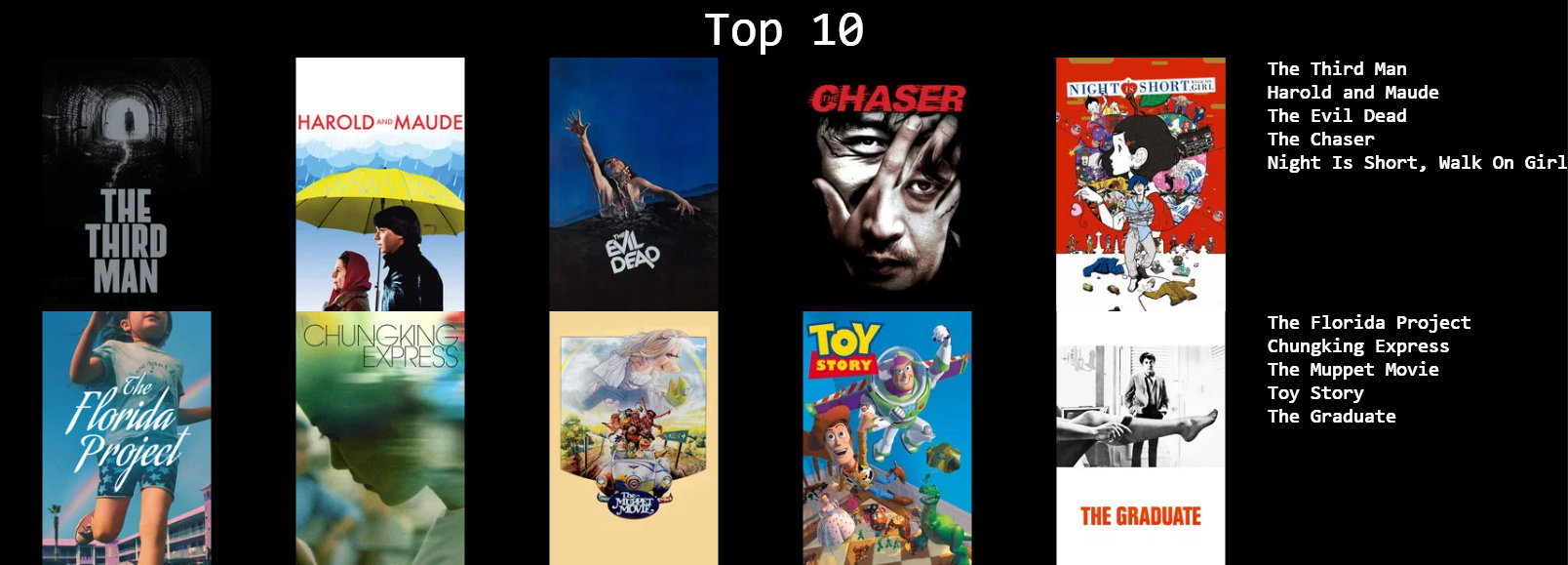 >>219941640>1: Lawrence of Arabia >2: Rocky>3: The Last Picture Show >4: Carnival of Souls>5: Inherit the Wind>6: Great Expectations (1998)>7: Goodfellas >8: Mulholland Dr.>9: The Graduate >10: It Follows