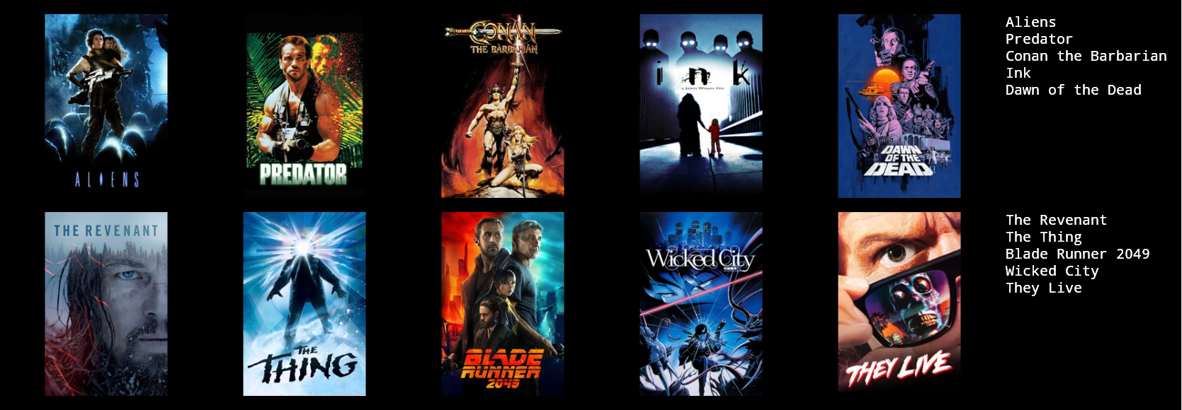 >>219941660For me:01.Conan, the Barbarian.02.Predator.03.The Terminator.04.The Running Man.05.Red Heat.06.Total Recall.07.Conan, the Destroyer.08.Red Sonja.09.Commando.10.Raw Deal.