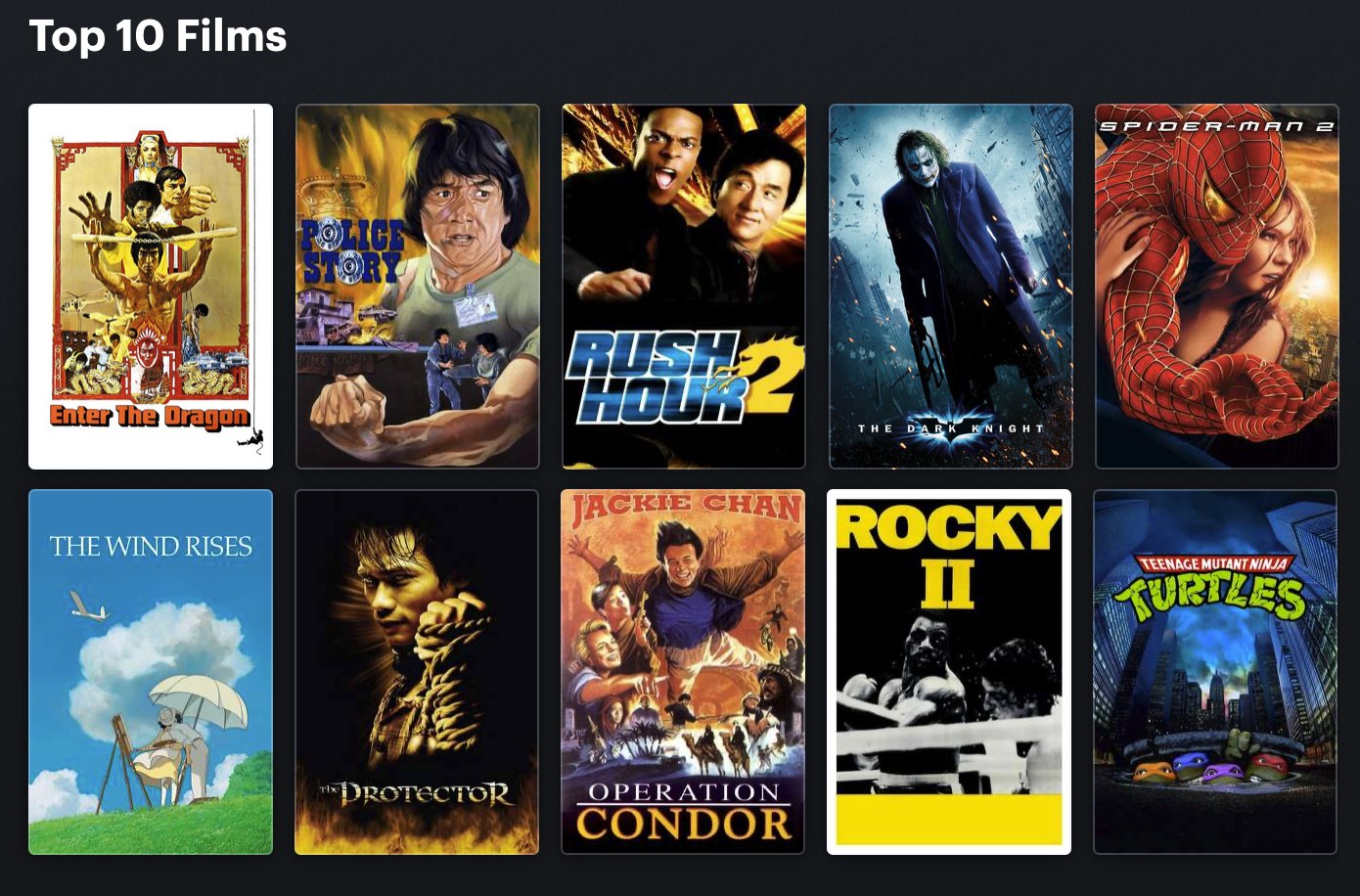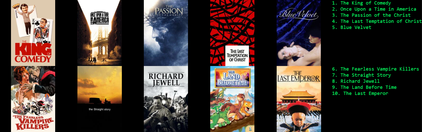 >>2199416401) The Passion of the Christ2) Goldfinger3) The Spy who Loved Me4) Gladiator5) Brother Sun, Sister Moon6) Napoleon Dynamite7) Lawrence of Arabia8) North by Northwest9)The Muppet Christmas Carol10) End of Eva