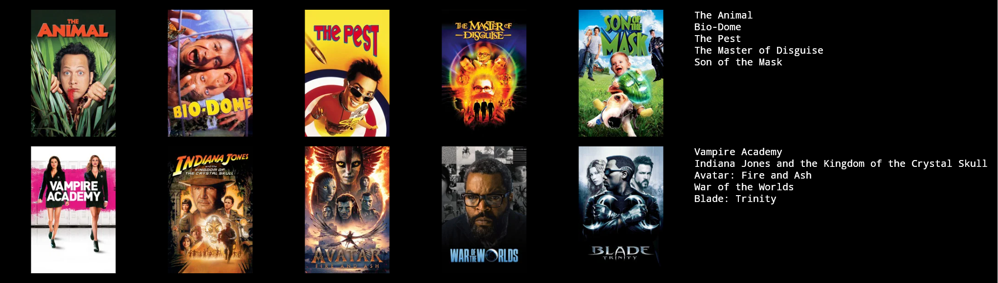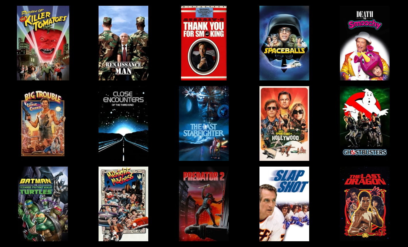 >>219941640Joe DirtIdiocracyGalaxy QuestGooniesDown PeriscopeNational Lampoon's Christmas VacationUnderworldThe Fall The Big LebowskiCity of God