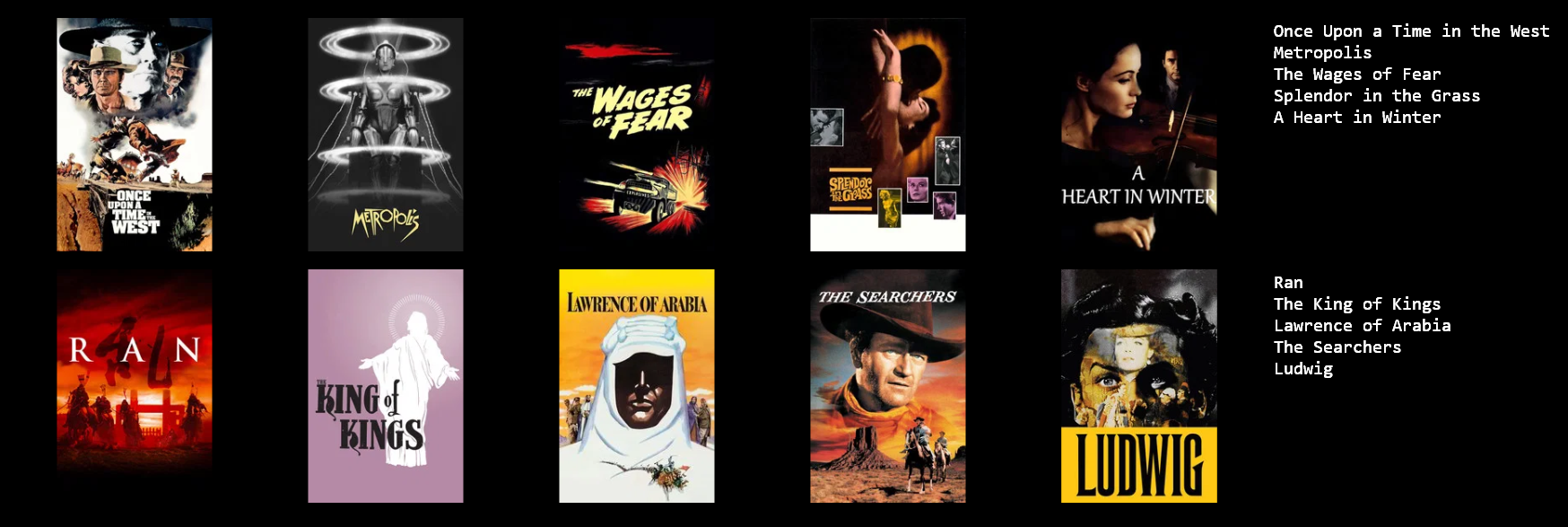 SeppukuRanExcaliburConanRoad WarriorAlfredo GarcíaVirgin SpringNibelungenThey LiveCidThese or 10 John Fords.