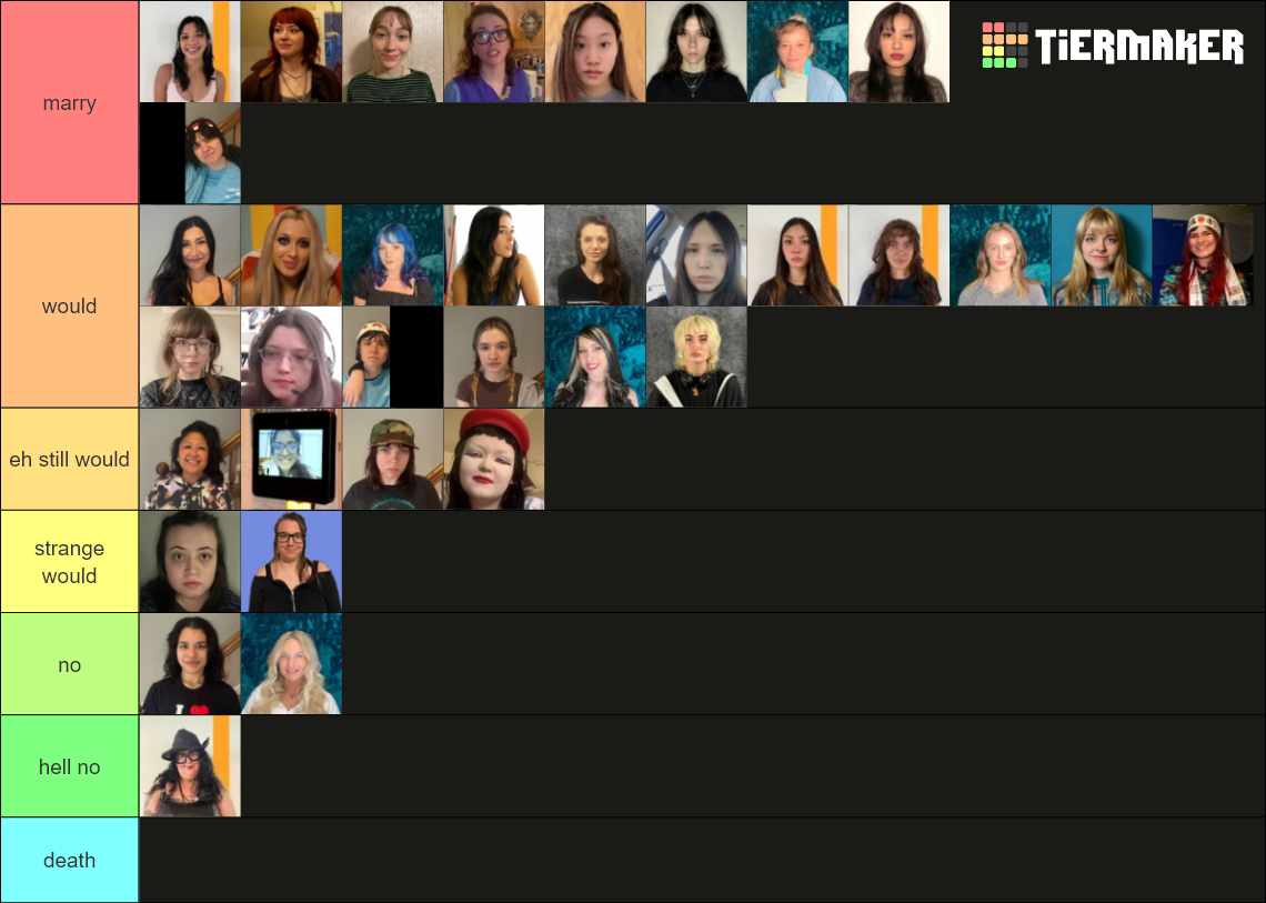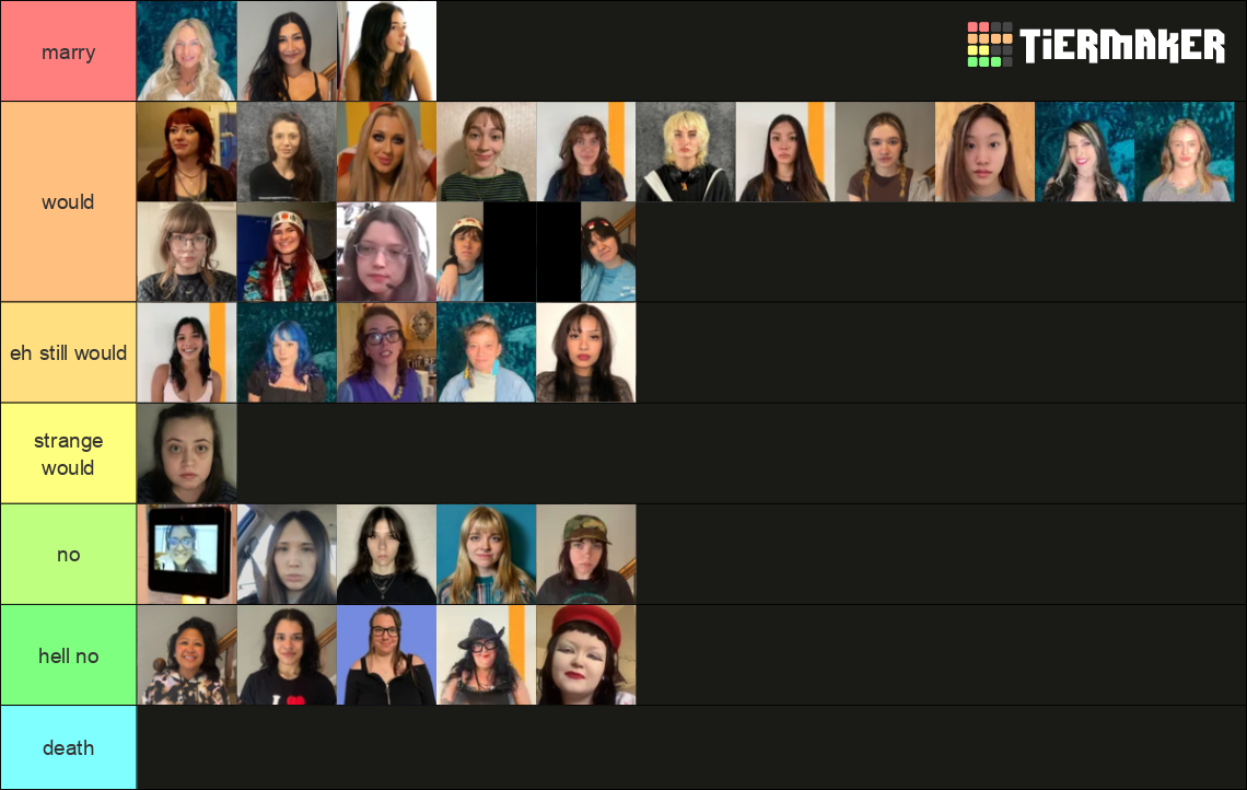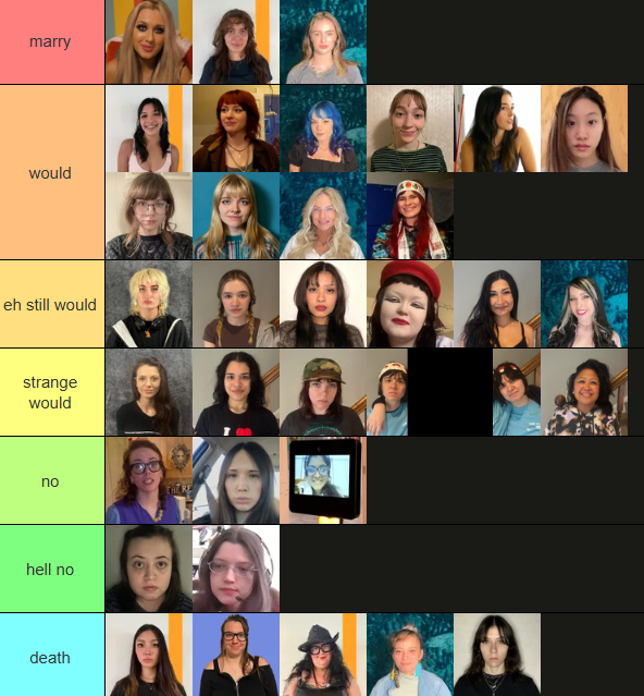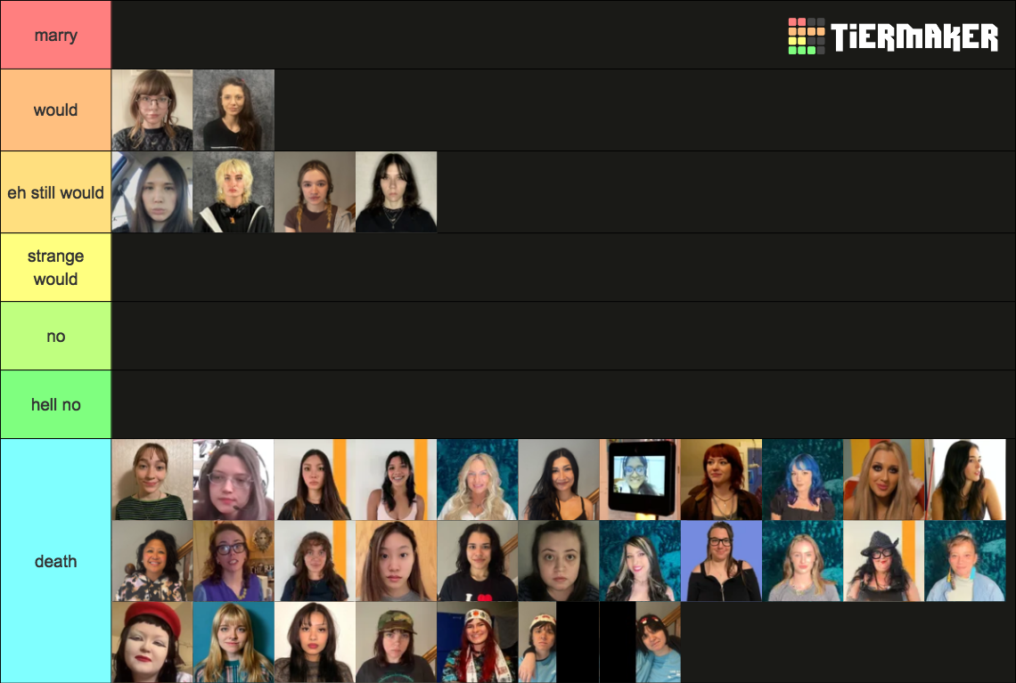>>219950412You cant marry 8 people. Dude people who put everyone in S in a tier list are cowards. I skip over those. S is for favorite.