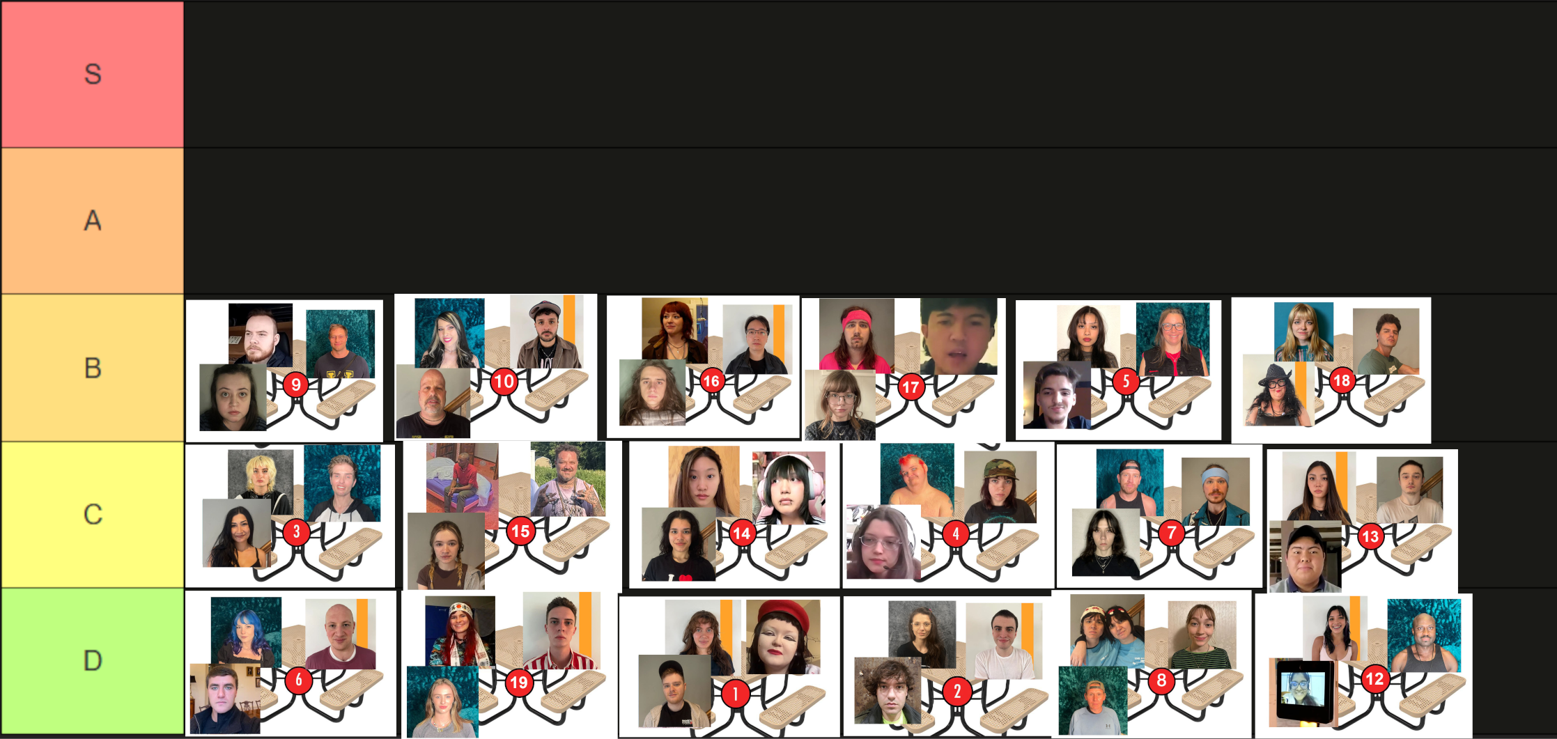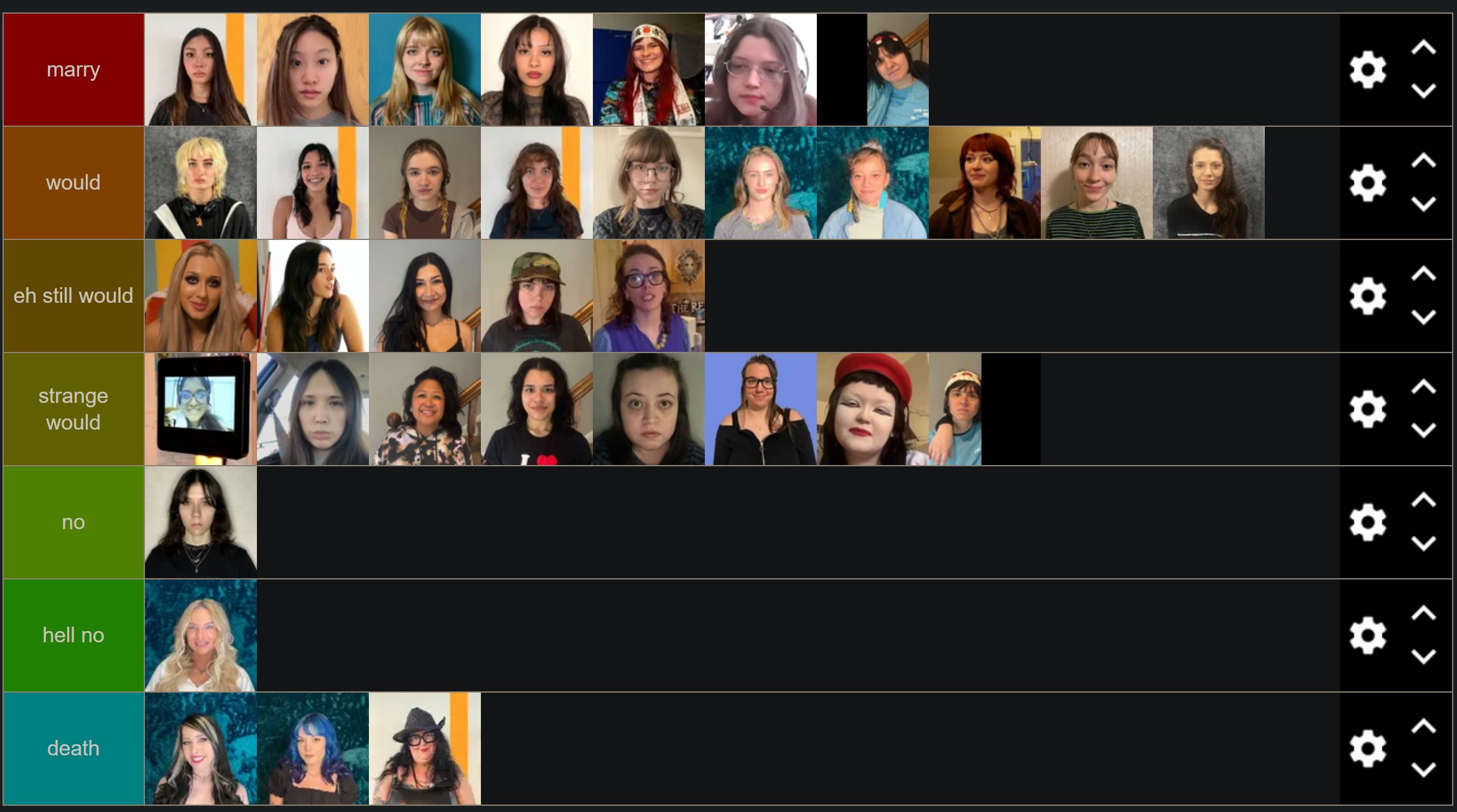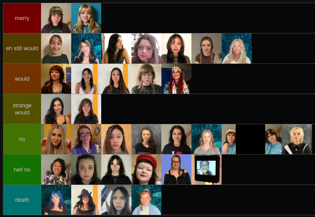 >>219950412You cant marry 8 people. Dude people who put everyone in S in a tier list are cowards. I skip over those. S is for favorite.