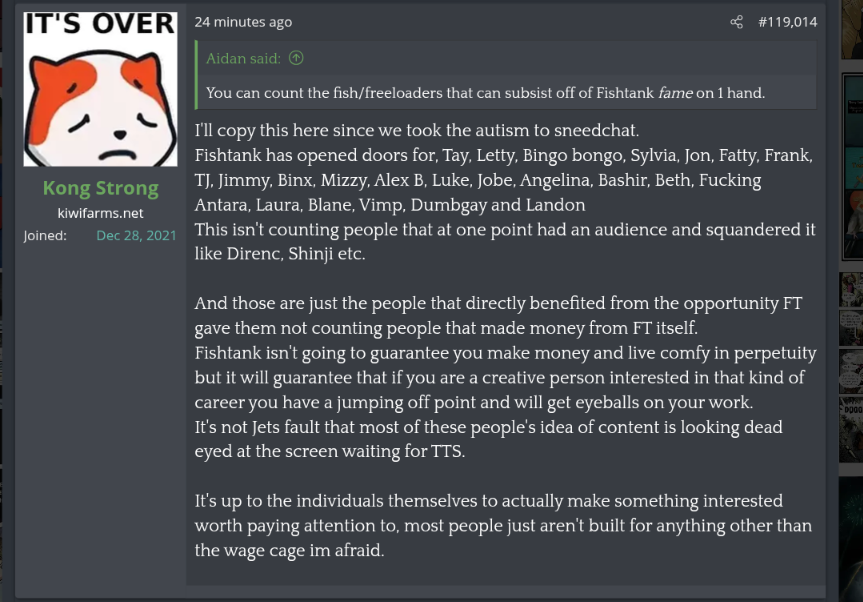>fishtank has opened the doors for [people who have never gotten any kind of fame outside of streaming to 20 people]Do Kiwifags really?