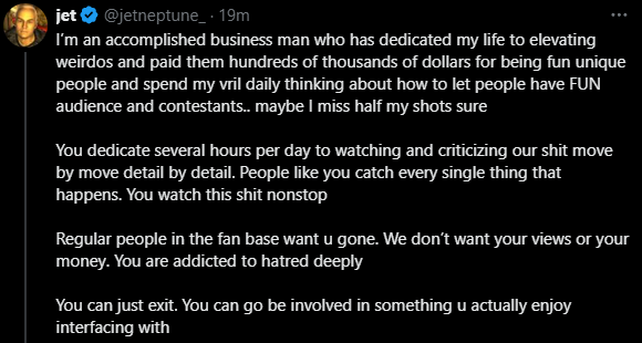>>219951403daniel being told by jet he can make it as a streamer and months after while he had 3 viewers i asked him about his plans and he just said his only really plan for the future is to get better at streaming it's just so sad they degrade people and actually convince them of that insane bullshit is crazy.I think the reason why people really think "streaming is viable" is because the alternative is they actually have gotten nothing from fishtank. Even if the have 2-10k followers on ig/twitter or something from it they have no ability to monetize it or make anything anyone cares about. They just focus on streaming because otherwise it was literally for nothing.