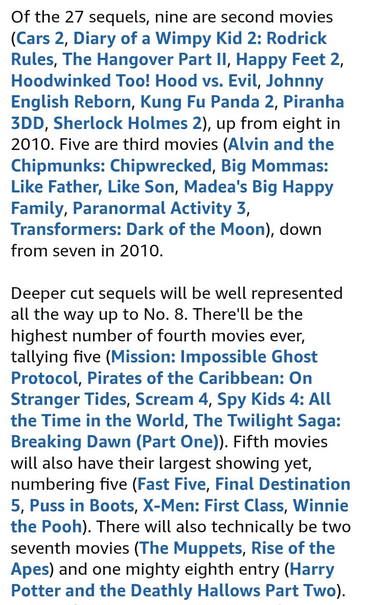 >Hoodwinked Too, Diary of a Wimpy Kid: Rodrick Rules, Kung Fu Panda 2, The Hangover Part II, Cars 2, Happy Feet Two, Johnny English Reborn, Sherlock Holmes 2Rodrick Rules aside, this was a pretty weak year for second installments