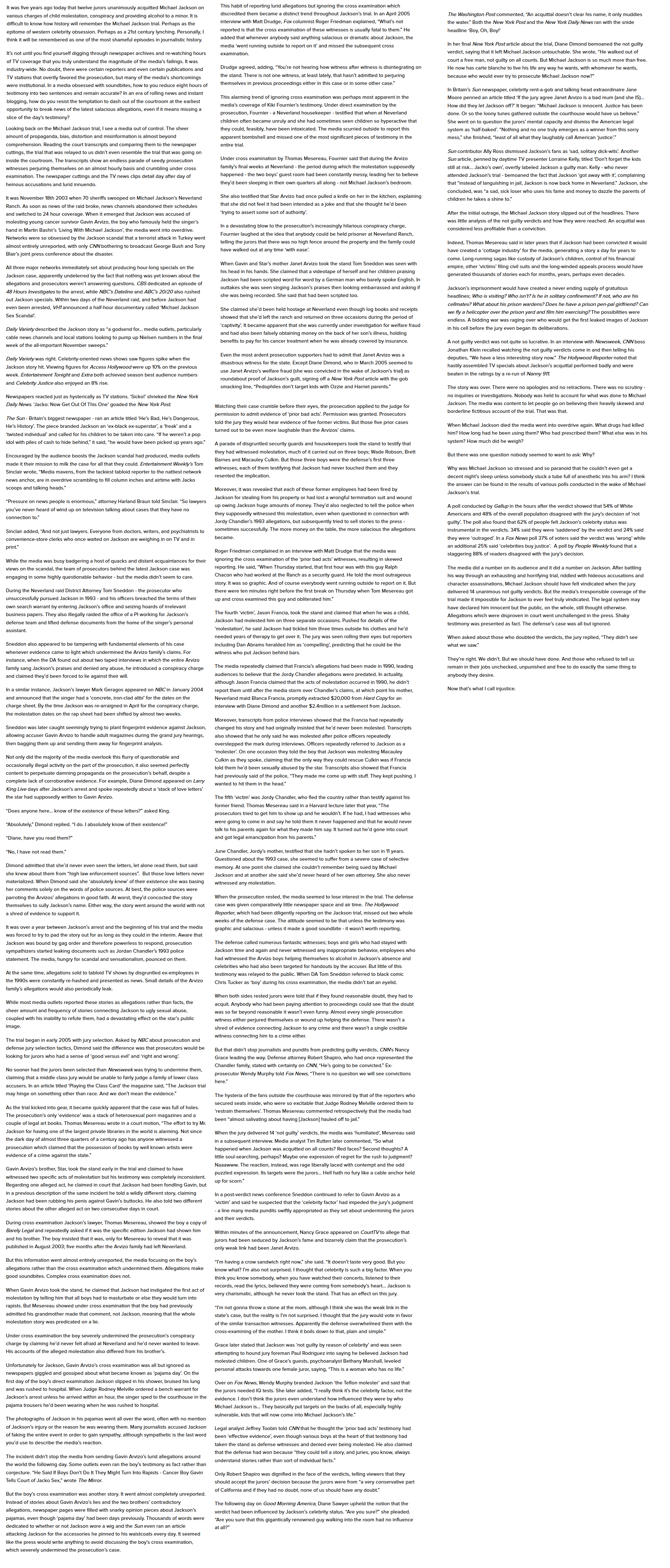 >>220001943Never found a shred of evidence despite a months-long FBI raid and spying on him, listening to his calls etc. People who testified against him had massive holes in their stories like describing his dick completely wrong. If MJ did do anything he'd have to be a Moriarty level criminal genius and he doesn't look the type. More likely he's simply a weirdo with stunted mental growth who genuinely thinks carousel rides and sleepovers are rad in his middle age like he's still 6.Until you can find some actual hard evidence I say not guilty.
