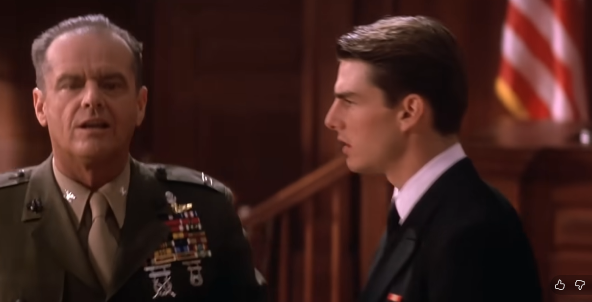 You know, this scene is usually given as an example of amazing moviemaking, but having re-watched it recently, it feels amateurish. Cruise is overacting, screaming and gesturing too much. Nicholson delivers his monologue like he had memorized it the previous day, not like he actually meant it.
