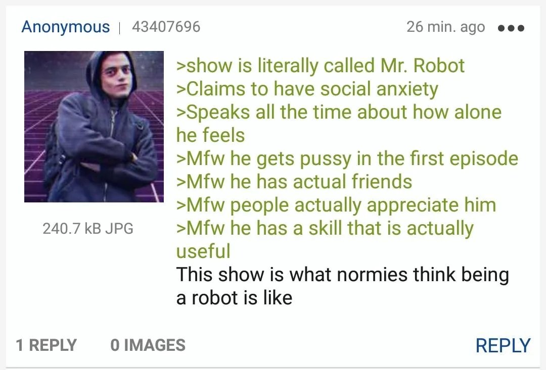 >>220044522>Is it that hard to portray an autistic friendless loser incel accurately?Tell me, Anonymous Poster #220044522, how would you make an interesting television show about a man who never leaves the house except for groceries, does nothing but consume media and jerk off, and never talks to anyone except maybe his parents once a week?Realism is not something to aspire to when writing fiction. If I wanted reality I could read the news or go outside.