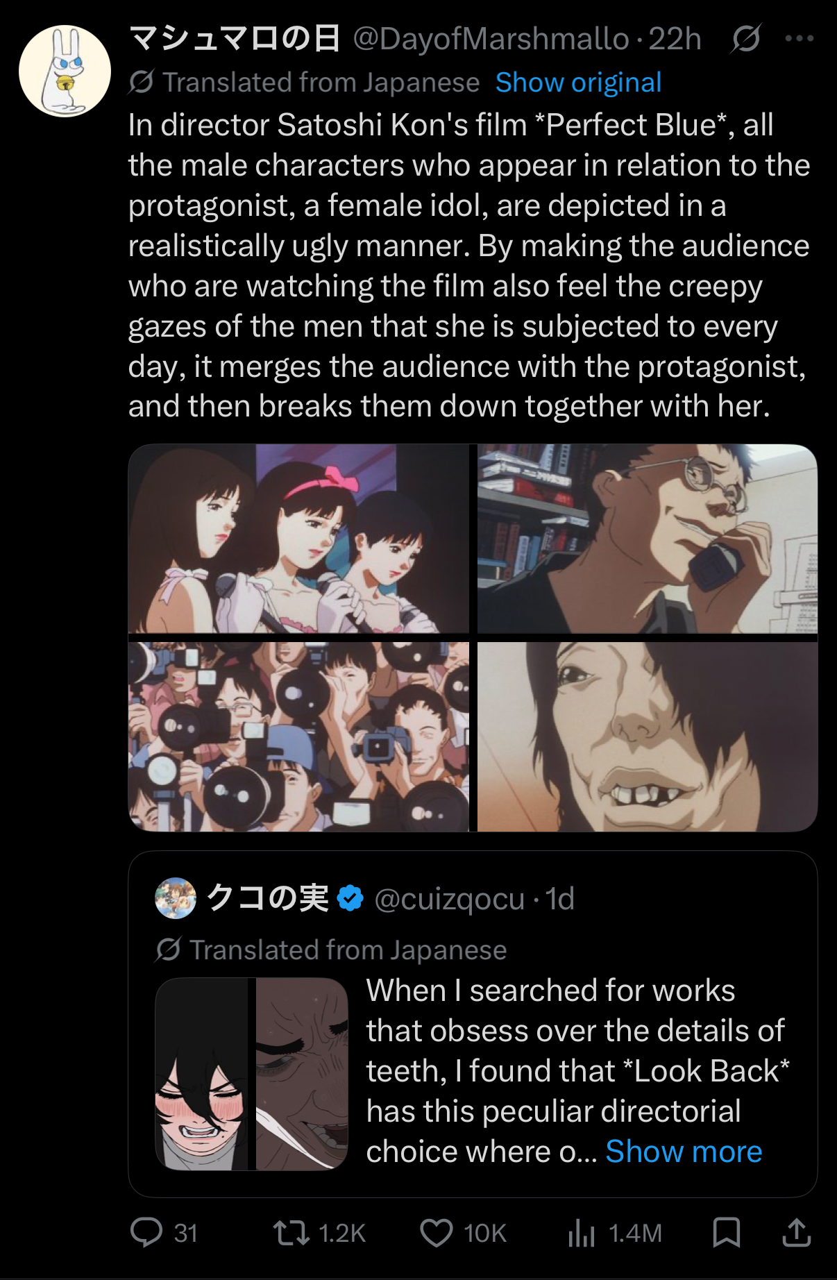 >>220046605No that's just Kon's artstyle, he famously despised idealized appearances and escapism. What a fucking larping retard that poster is.