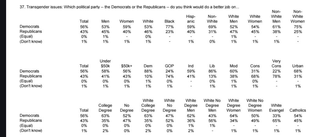 Transphobia's not popular anymore according to fox newshttps://static.foxnews.com/foxnews.com/content/uploads/2026/04/fox_april-17-20-2026_national_cross-tabs_april-22-release.pdf