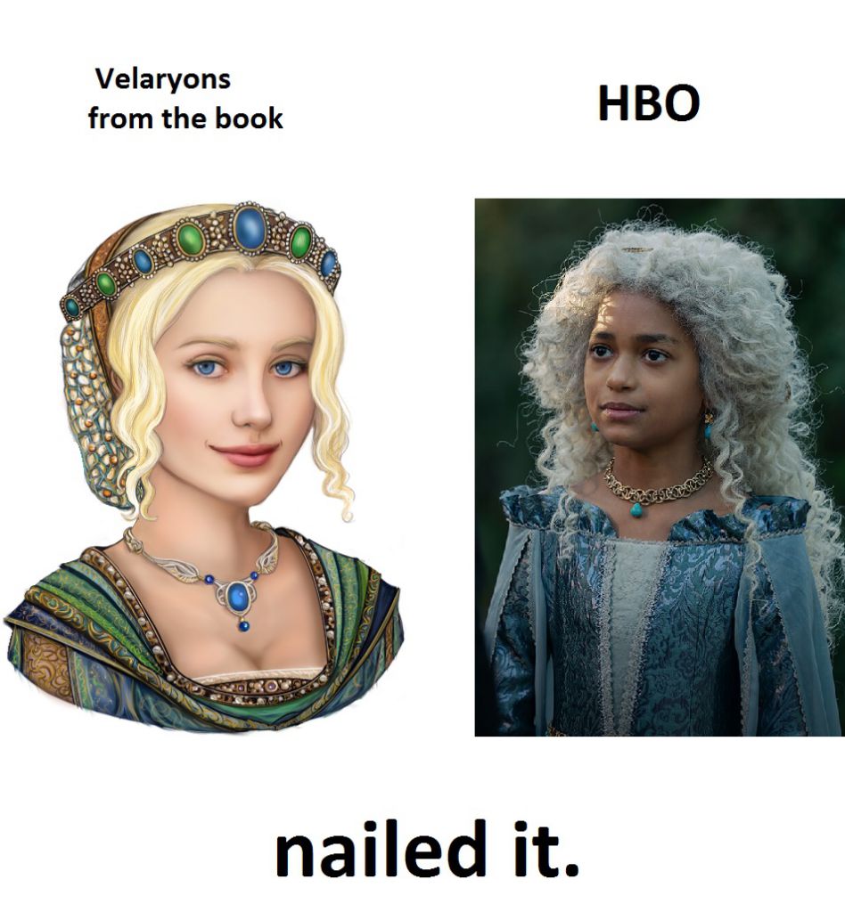 >>220094813You’re forgetting the fact that the velaryons aren’t black and that making them black does nothing but dumb down the story as well as create a genetics issue since they’re descendants of Targaryens who are all white.