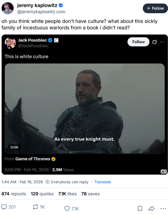 >>220093402“People” like that only like Dunk because culture war sloppers on their timeline praised it as wholesome chungus and White, and they don’t like HOTD because it’s le foid show and has heckin black people in it. They’re not capable of real value judgements, it’s always chud politicsDunk is generic fantasy that could have aired on Amazon or Netflix and fit in perfectly, it’s not even spiritually GoT