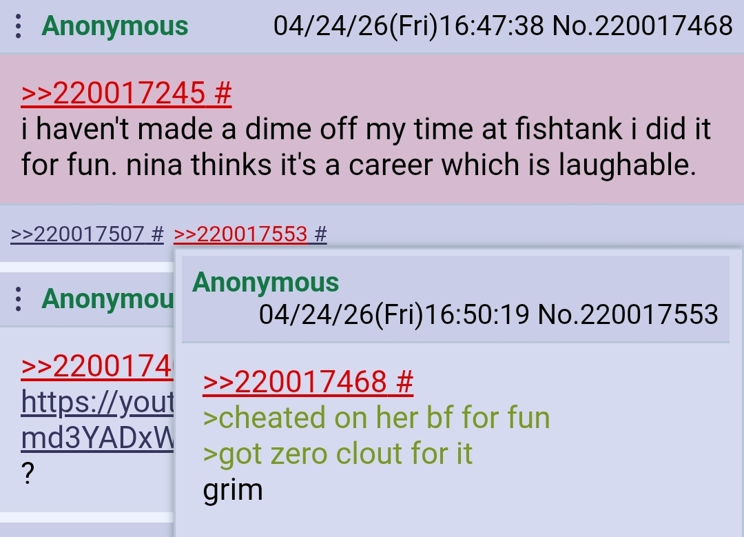 >>220095599When people suggest that fishtank doesn't melt people's brains, I will refer them to this post.