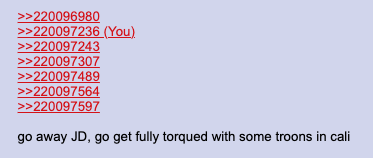 >>220096980>>220097236>>220097243>>220097307>>220097489>>220097564>>220097597go away JD, go get fully torqued with some troons in cali