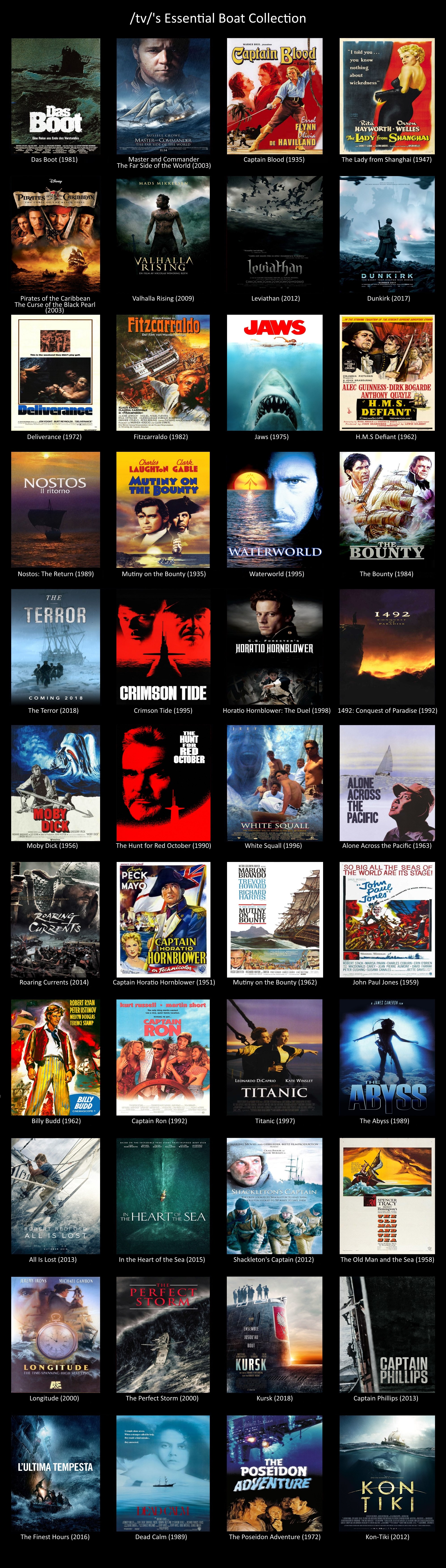 unironically the first three Pirates of the Caribbeanif subs count, Das Boot, The Hunt for Red October, and U-571