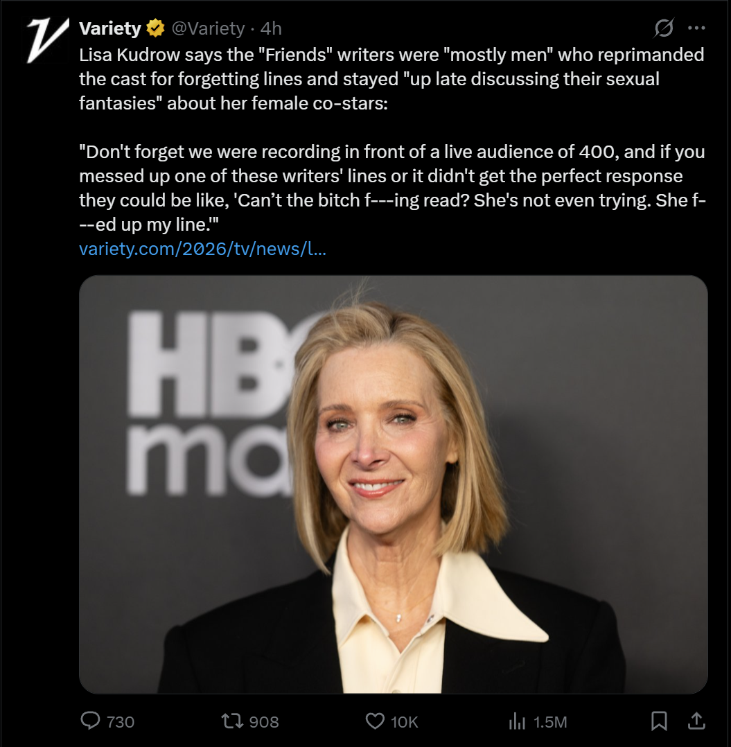 >The behavior of the “Friends” writing team was famously exposed by Amaani Lyle back in the early 2000s. Lyle, who worked on the show in 1999 on Season 6, brought a lawsuit against Warner Bros. Television for the writers’ room conduct. In the suit, she claimed that the “Friends” scribes frequently made sexual and racist remarks, and as the writers’ assistant, she was forced to take notes on everything that was said in the room. The case eventually made it to the Supreme Court, which ruled against Lyle after deciding the coarse demeanor was a necessary part of the work environment.lol