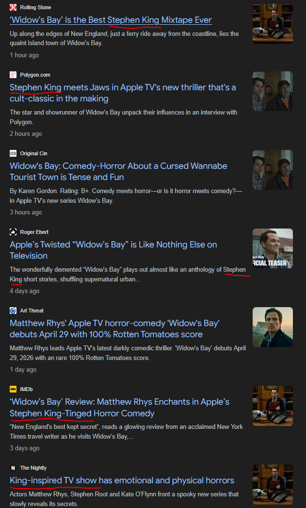 >>220130276Yes anon, a dozen different sites and writers are all organically calling it "stephen-king-esque" completely organically. >>220123429