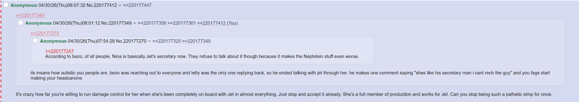 >>220177247According to bezo, of all people, Nina is basically Jet's secretary now. They refuse to talk about it though because it makes the Neptstein stuff even worse.