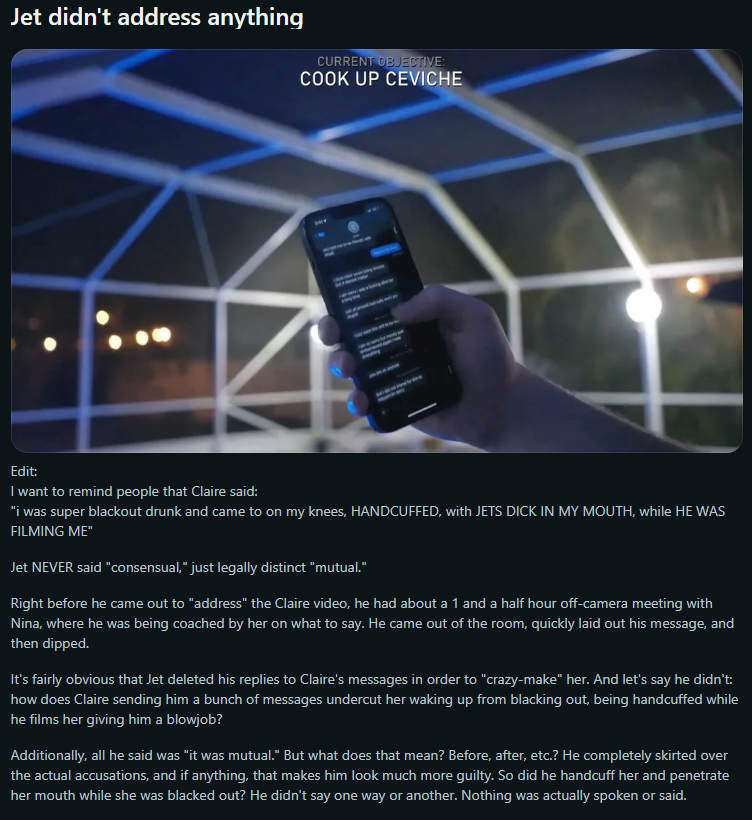 >>220182645Yes, you lack agency when you are handcuffed. This is why police officers handcuff you. Afterwards, she is an abuse victom and Jet used abuser tactics.