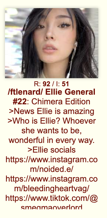 >>220182639I like how the Britbong simp who comprises like 90 percent of the posts in those threads tried to say to a naysayer that Ellie actually had a personality and wasn't a whore, and Ellie herself had to reply on instagram with "No, actually I am whore. The other guy was spot on" lol