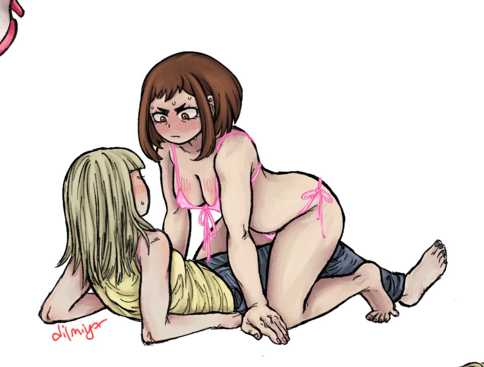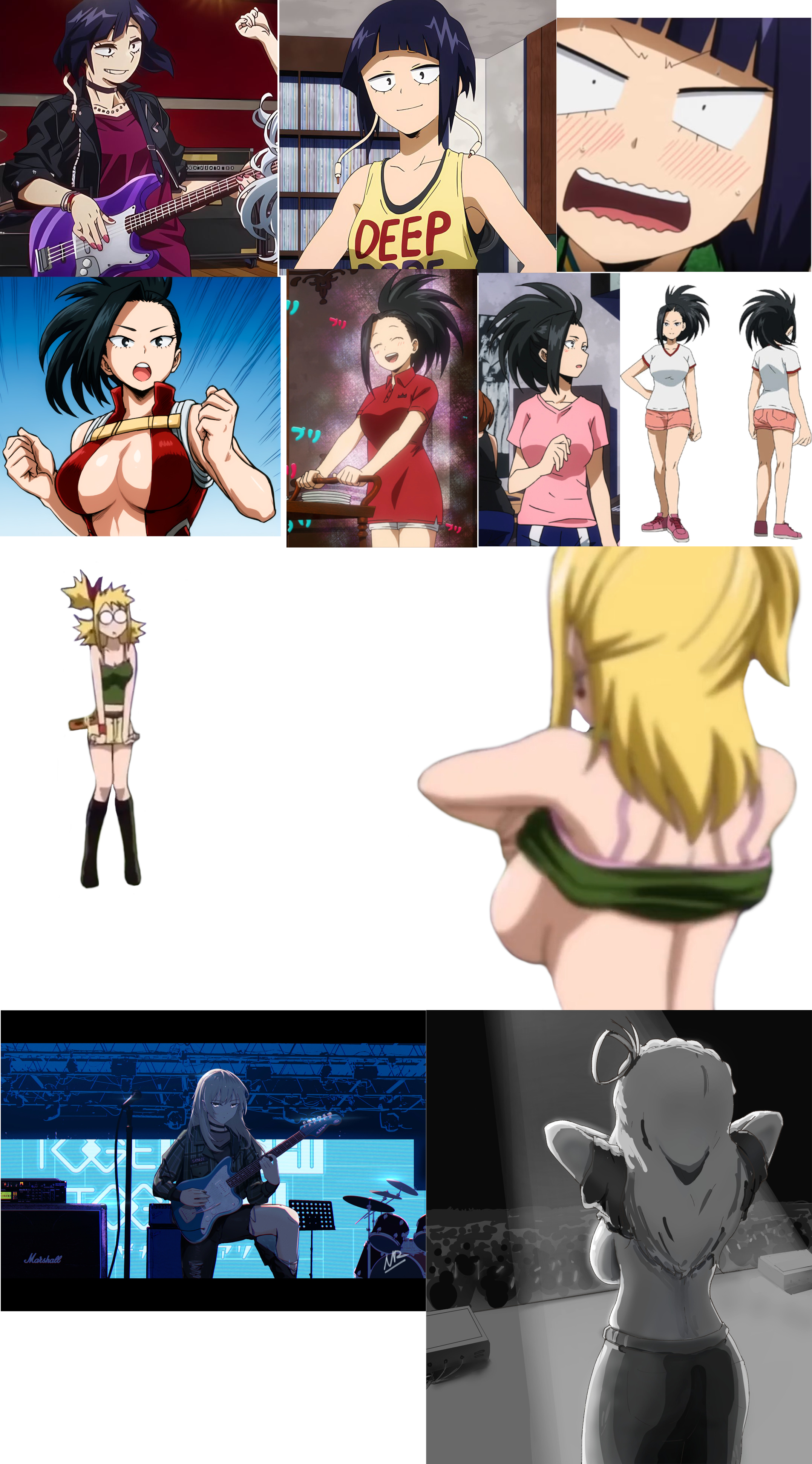I have the worst kind of yuri brainrot right now, so I am humbly requesting some art of Kyoka Jiro and Momo Yaoyorozu in kind of a... specific situation. Jiro is up on a stage, playing her guitar for an audience, and Yaoyorozu is part of the crowd. From a similar perspective as the two references at the bottom, Yaoyorozu is excitedly lifting up her shirt and flashing her breasts at Jiro while she's performing, which causes Jiro to have a shocked reaction similar to the top right.