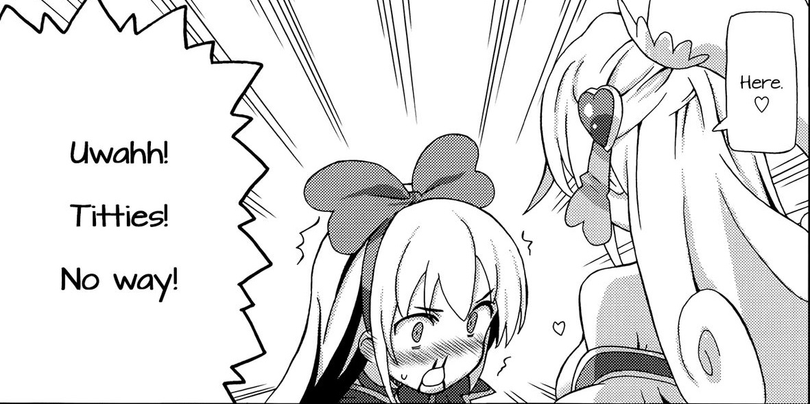 >Silly lewd story between a sweet but secretly perverted peasant woman and a vain, overdramatic, busty noblewoman>Relationship starts with the noblewoman trying to pick on and bully the peasant woman, only for this to have very little effect because the peasant woman is too distracted by her 'bully''s tits, making lewd, perverted comments on how sexy the noblewoman's breasts are>But even as the noblewoman's attendants and flunkies gasp in shock and offense, the noblewoman's vanity takes hold, and she relishes in her breasts being praised, smugly hefting them up and demanding the peasant woman give them the respect they deserve, leading into the peasant woman launching into an almost absurd tirade on how big and round and perfectly shaped the noblewoman's breasts are, how they sag in just the right way, the vain noblewoman eating every word up>She even allows the peasant woman to touch her breasts, something the other woman does eagerly, massaging and groping those fat noble tits while eagerly babbling about how soft and full and heavy those noblewoman breasts really are, earning a 'Ohohohoho~!' laugh and smug response that of course her noble breasts are perfect>To the utter bafflement of everyone around them, the noblewoman takes the peasant woman as a servant, someone who will attend the noblewoman's breasts and give them the praise and service they deserve, a task the peasant woman is more than up to.>As a result, the anime is filled with constant lewd moments between the two women, with the peasant woman eagerly praising and servicing her mistress' breasts while the noblewoman eats it up, even actively participating by doing things like shoving her breasts in her servant's face, comparing her breasts to her servant's breasts or the breasts of other women, actively fueling her servant's breast fetish as much as she possibly can!